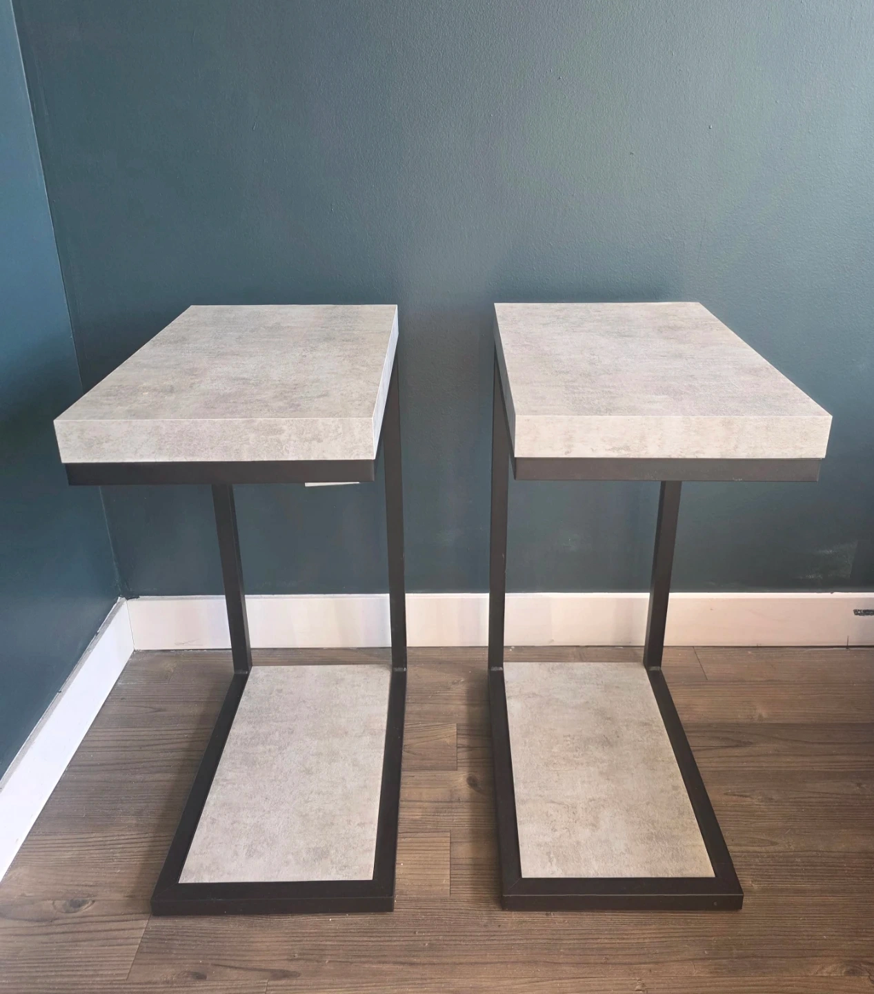Perfect for a modern living area, this sleek and sturdy side table is full of industrial details. Dark and flat, the metal base and legs are full of structure. Thick and defined, the faux cement top sports a simple hue that looks great when paired with delicate features. Bold angles and industrial hues create a depth-filled piece that is perfect for use with a sofa or chair. Add depth with the subtle variations in visual texture from the tabletop.