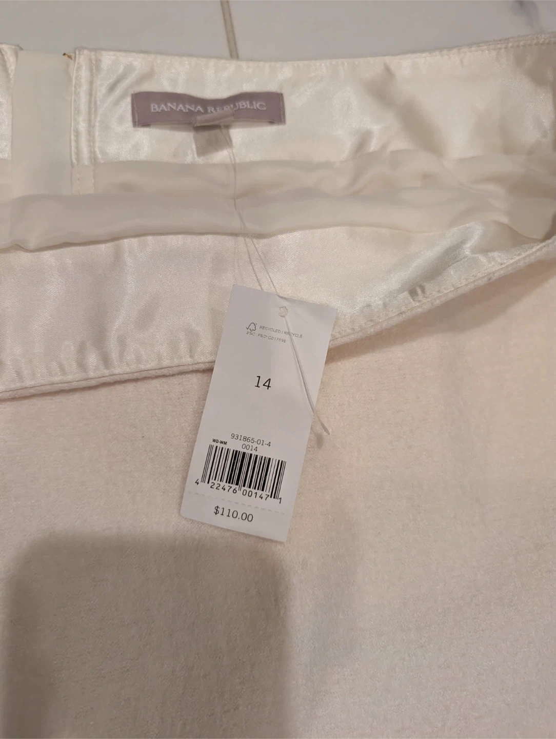 Brand new Banana Republic mini skirt with tags still attached. It's a classic cream colour with a wool blend fabric. Features a gold zipper closure at the back and a tailored fit. Size 14.