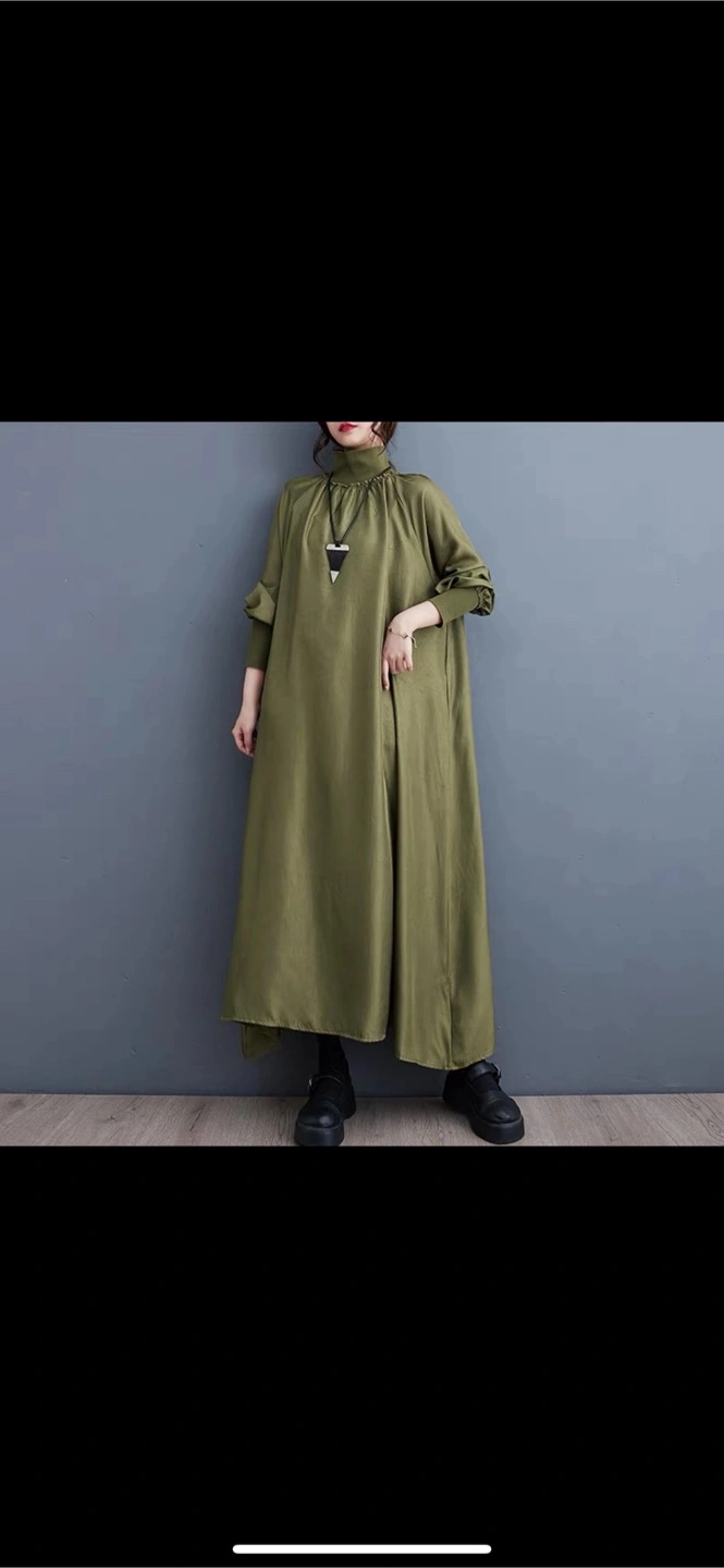 Selling a lovely olive green maxi dress! It features a high neckline and long sleeves, perfect for cooler weather. The dress has a relaxed, flowy fit and a unique asymmetrical hem. The material looks comfortable and stylish!