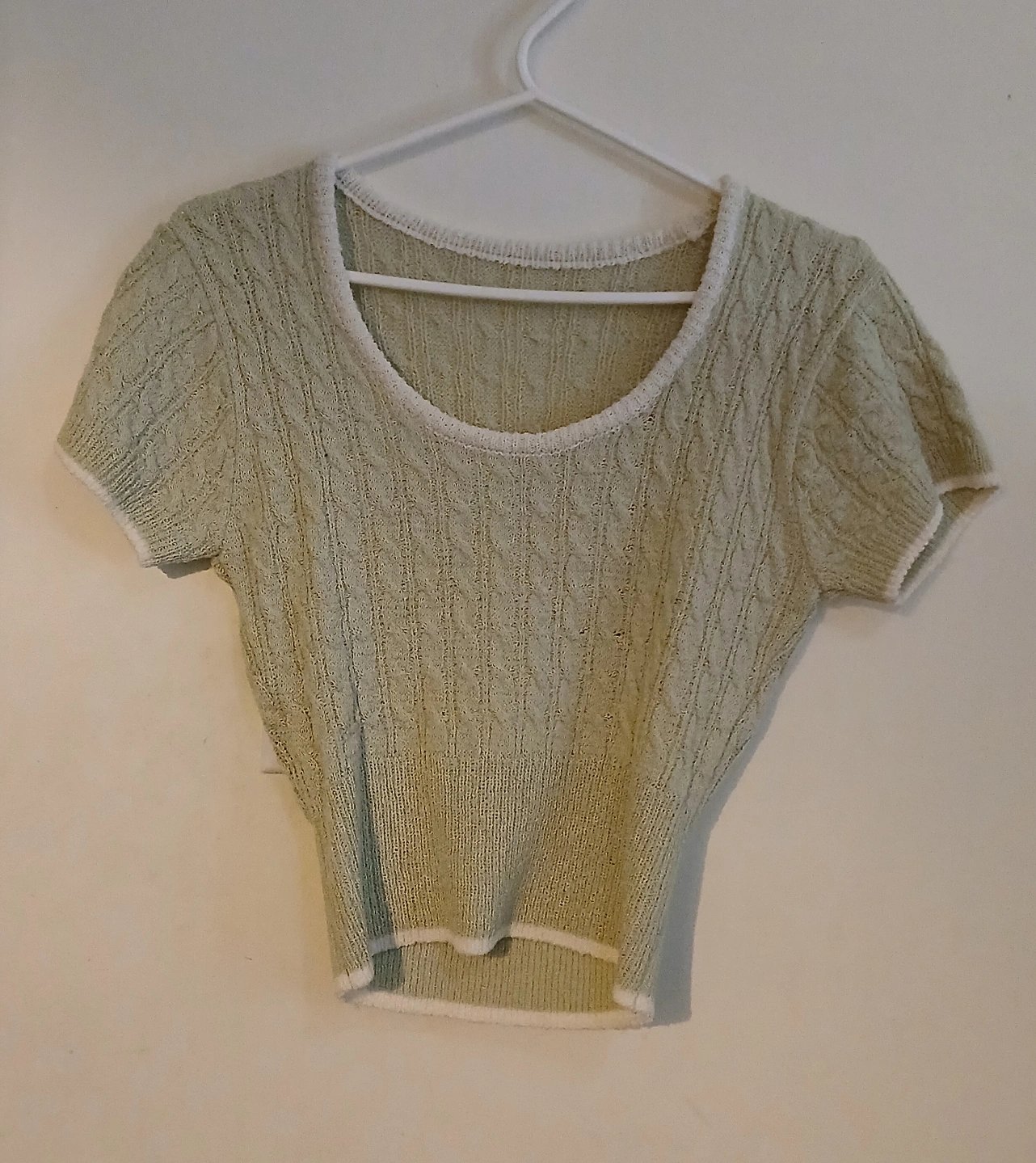 Adorable green cropped sweater. Features a cable knit design and short sleeves. White trim accents the neckline and perfect for spring or summer. not too thin and little bit thick (just little bit)