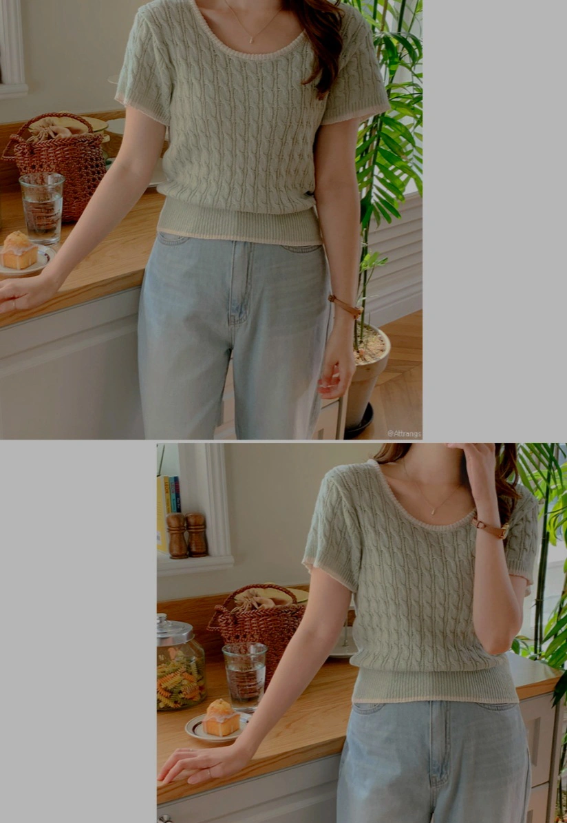 Adorable green cropped sweater. Features a cable knit design and short sleeves. White trim accents the neckline and perfect for spring or summer. not too thin and little bit thick (just little bit)