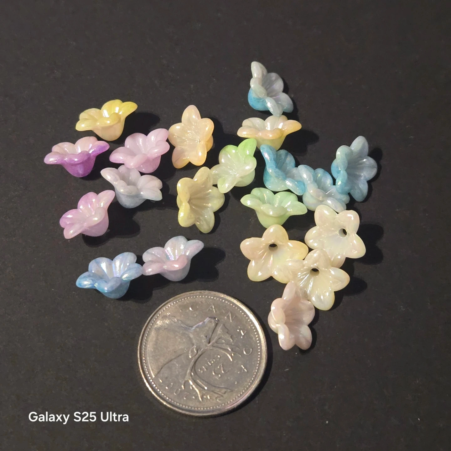 A collection of flower-shaped beads in various pastel colours, perfect for crafting and jewellery making! They have a lovely iridescent finish and are in great condition