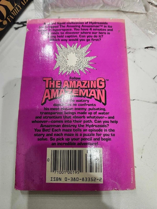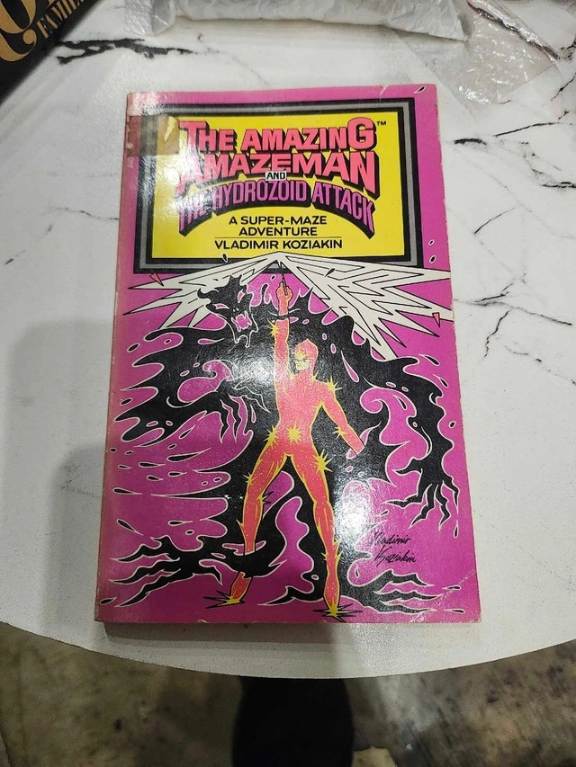 Dive into a nostalgic adventure with The Amazing Mazeman and the Hydrozoid Attack, a super-maze adventure by Vladimir Koziakin! This vintage paperback from 1983 is ready to challenge a new generation of puzzle solvers. While showing its age, this copy is in fair condition considering it's over 40 years old! I have set the price at $5, reflecting its vintage appeal and good, readable condition. Keep in mind that if the ad is up, the book is still available. So grab your pencil and get ready to navigate the Hydrozoid's watery depths! Cash accepted.