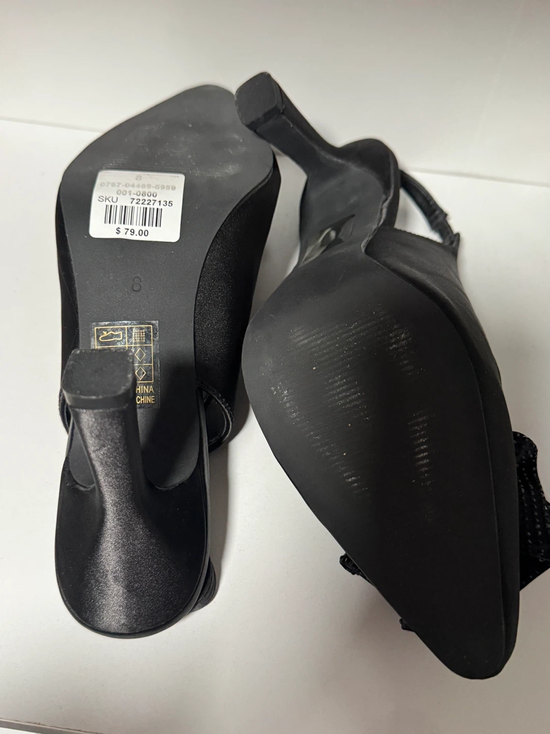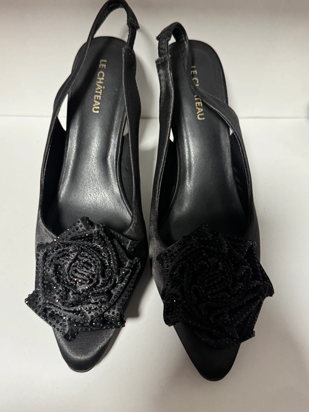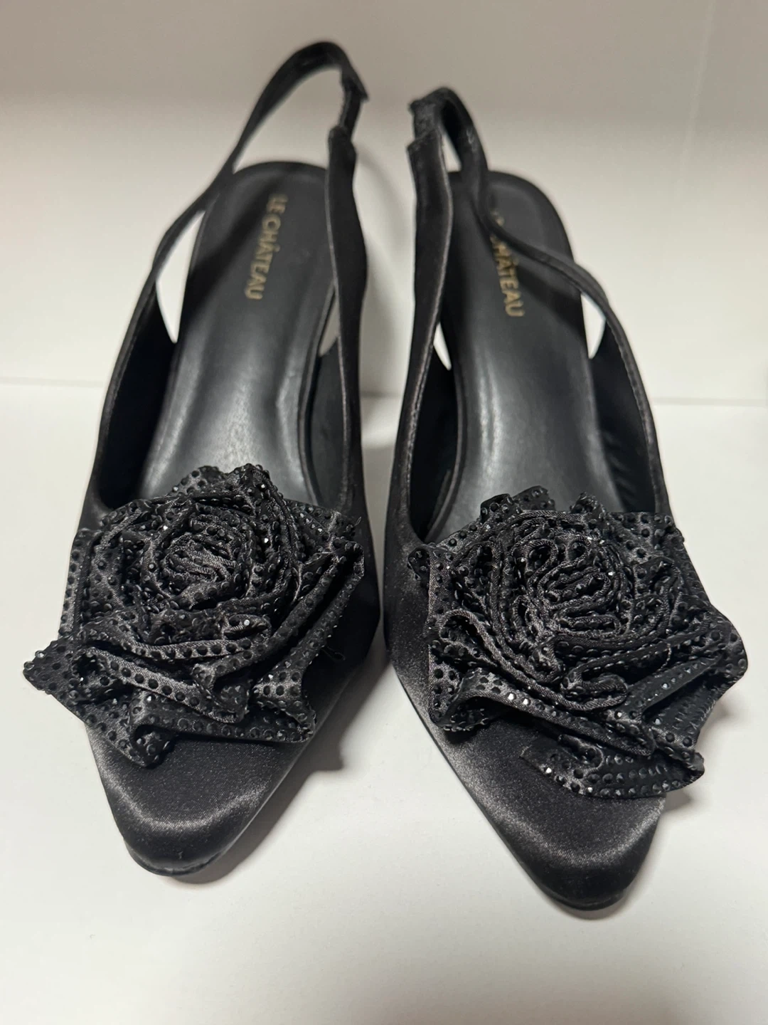 These LE CHÂTEAU slingback heels are in a classic black colour. They feature a beautiful rosette embellishment on the toe, made with satin material. The heel height appears to be moderate, suitable for various occasions. Size 8.