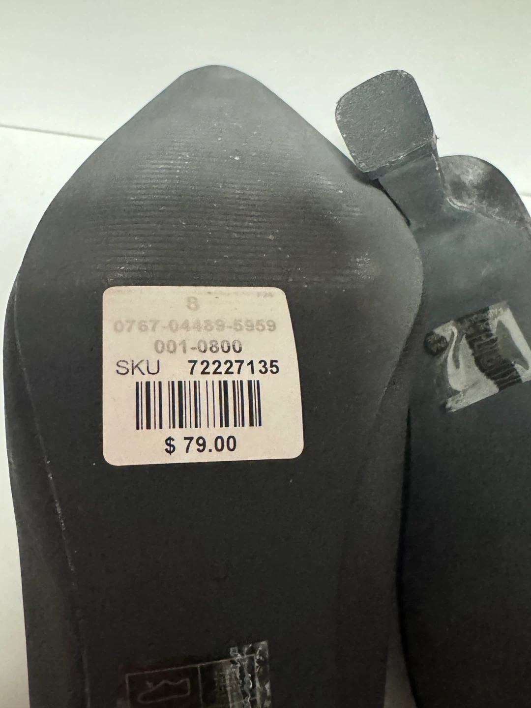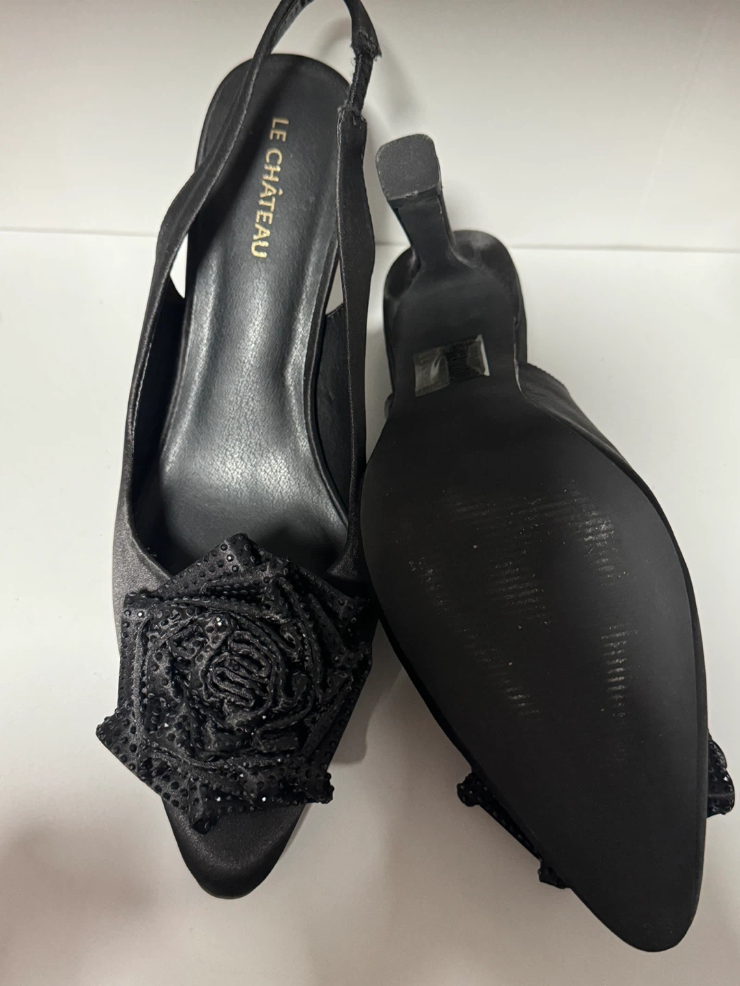 These LE CHÂTEAU slingback heels are in a classic black colour. They feature a beautiful rosette embellishment on the toe, made with satin material. The heel height appears to be moderate, suitable for various occasions. Size 8.