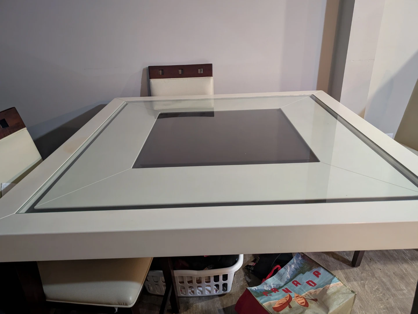 Selling a modern dining table with a square glass top. The table features a unique design with a central dark square and a white frame. It's in great condition and would be a stylish addition to any dining room!