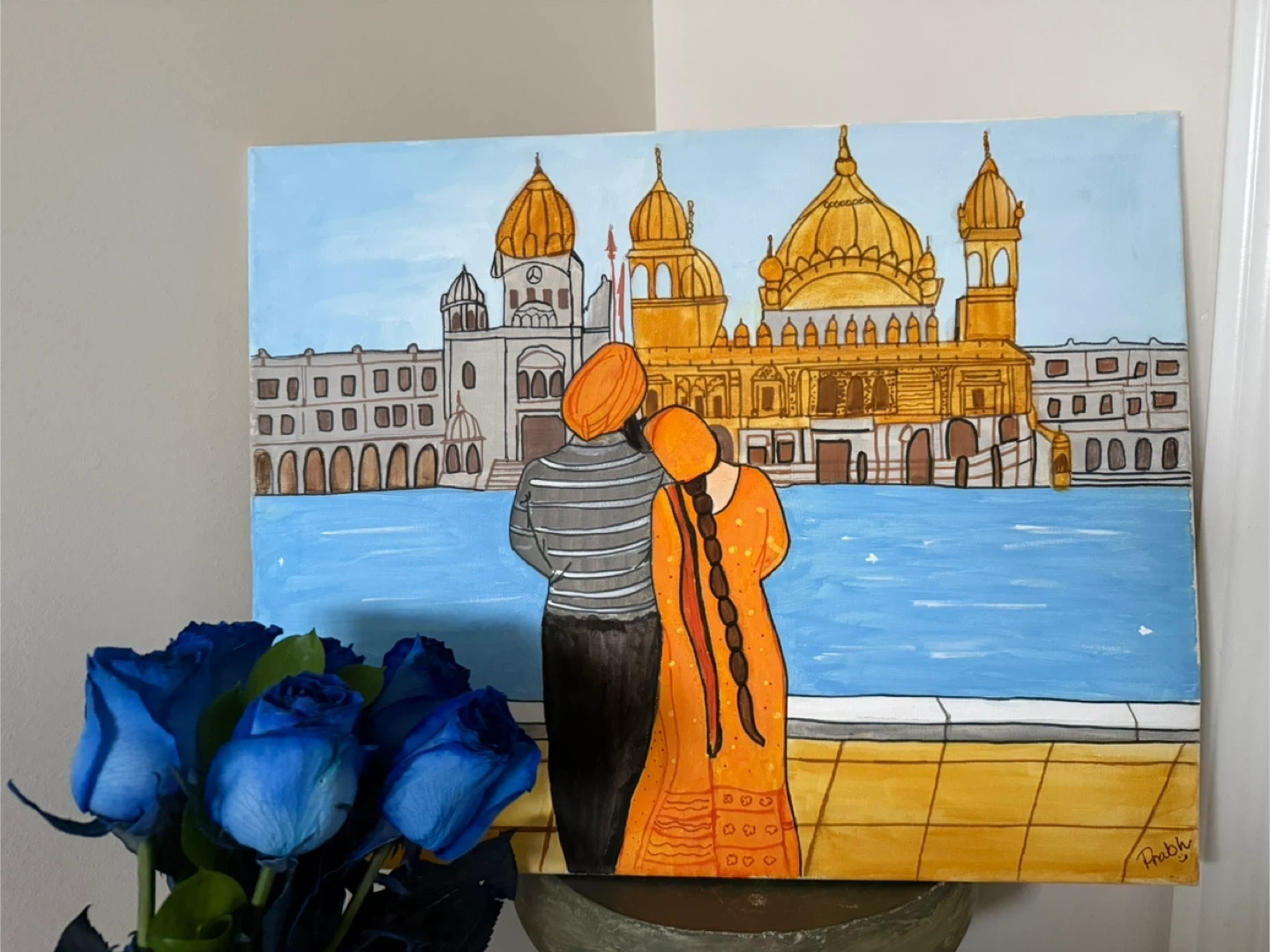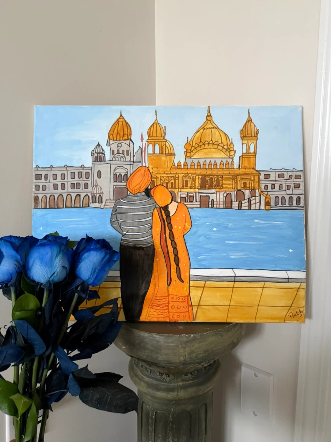 Bring love, peace, and spiritual beauty into your home with this handmade painting inspired by the Golden Temple. The artwork shows a couple standing together, admiring the holy view—symbolizing blessings, togetherness, and everlasting bond.