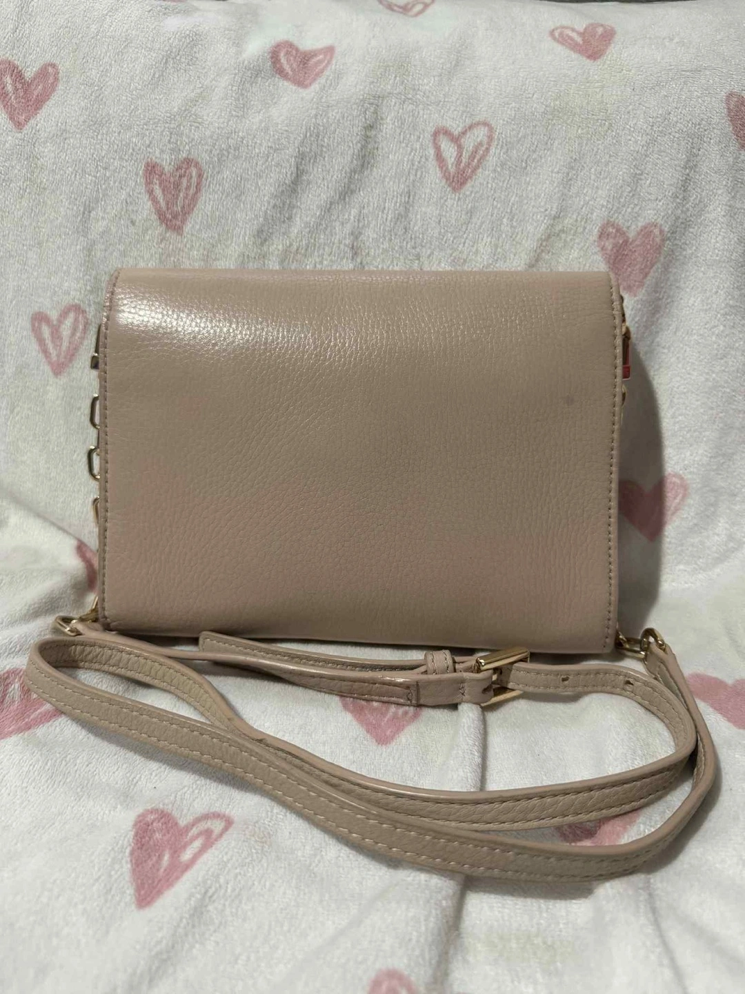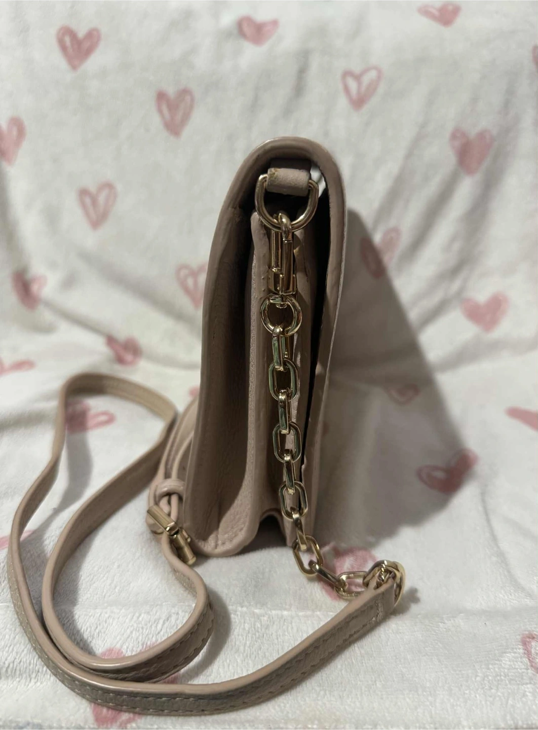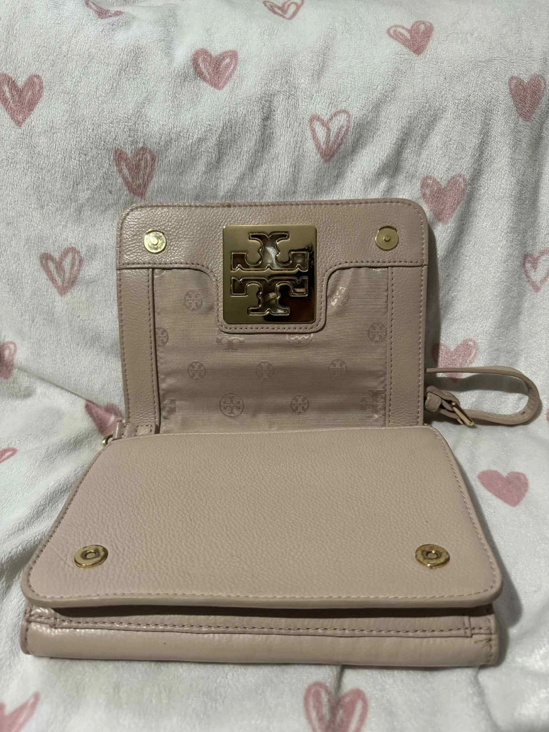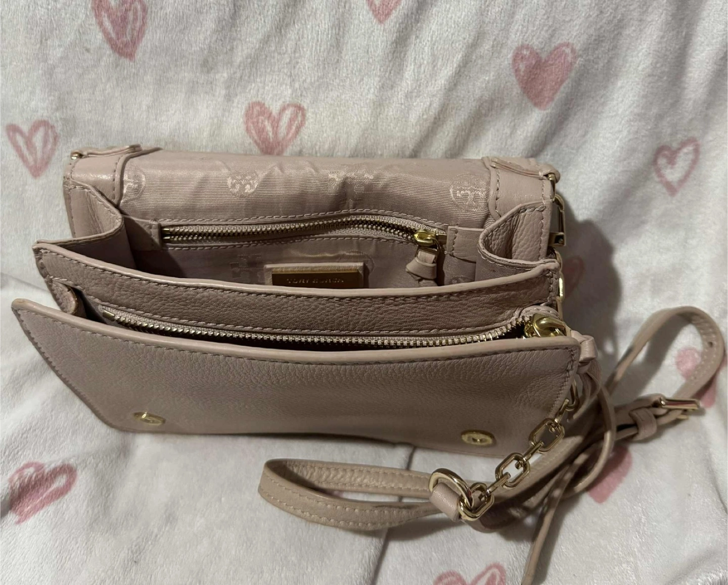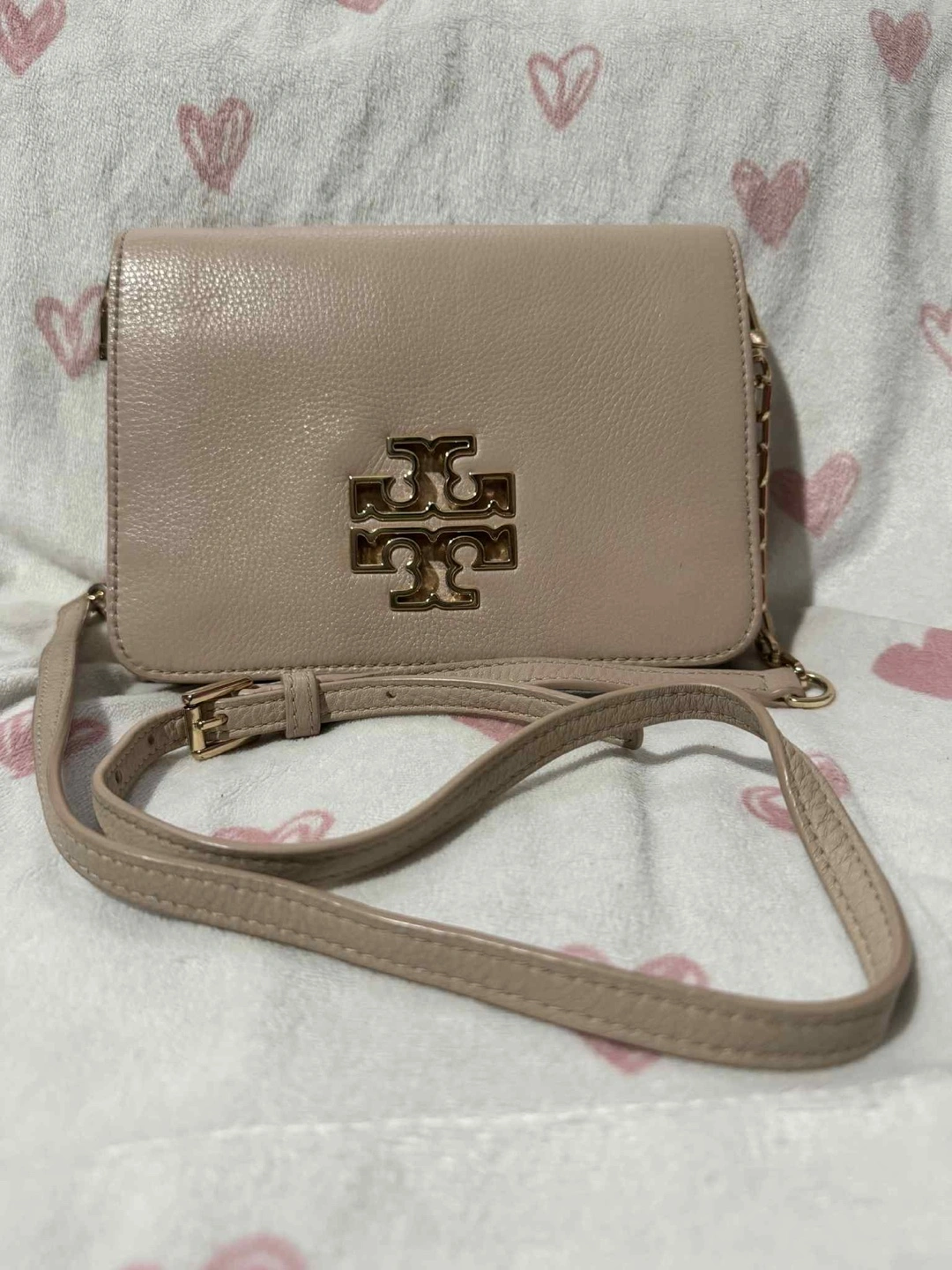 Tory Burch Britten Combo Pebbled Leather Small Crossbody Bag, in excellent condition, showcases a soft light pink to dusty pink color. The actual shade is a blend of light pink and nude, which the photo doesn't entirely capture. Hardware remains gold-toned and looks new.