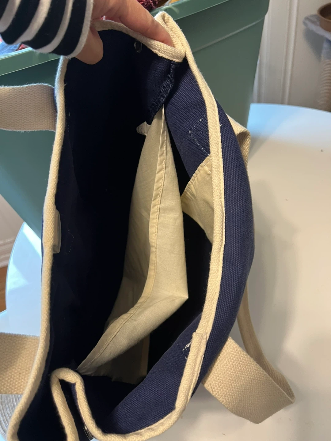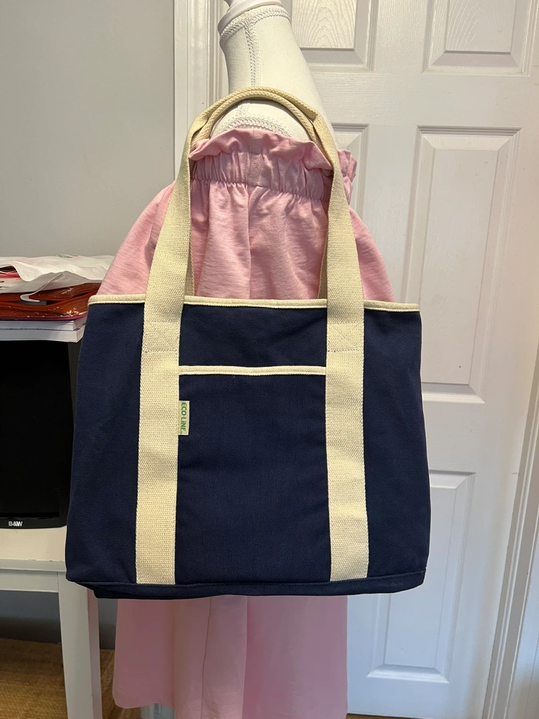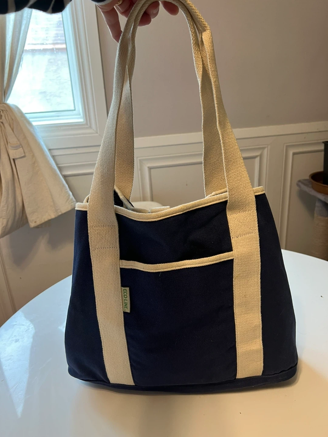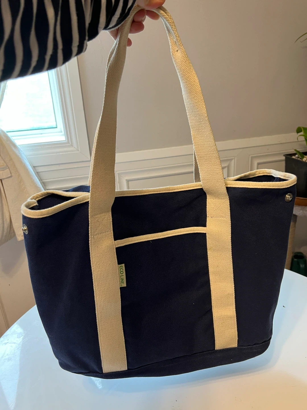 Buy & SellNavy Blue Canvas Tote BagNavy Blue Canvas Tote Bag$15ECOLINE navy blue canvas tote bag with cream trim and handles. It has a front pocket and snap closures on the sides. A handy bag for everyday use!ConditionLike newBrandECOLINEWHERE TO MEETCheck LocationView MapSELLERverifiedVioletaDufferin57142 reviews0 chats·0 favorites·2 viewsSEND CHAT TO SELLERHi Violeta! I’m interested in your listing.Hi Violeta! I’m interested in your listing.Get the Karrot app to chatSign In to chat