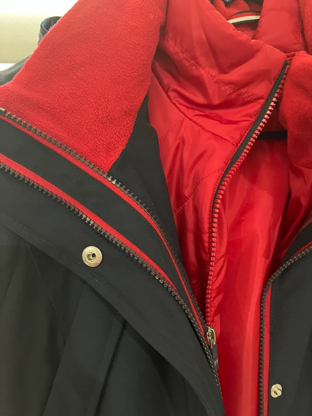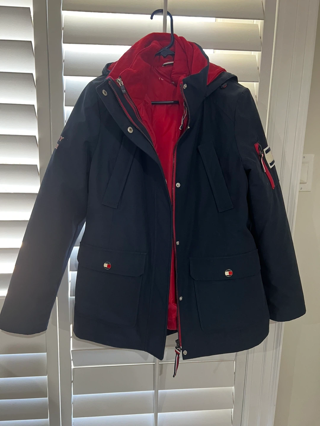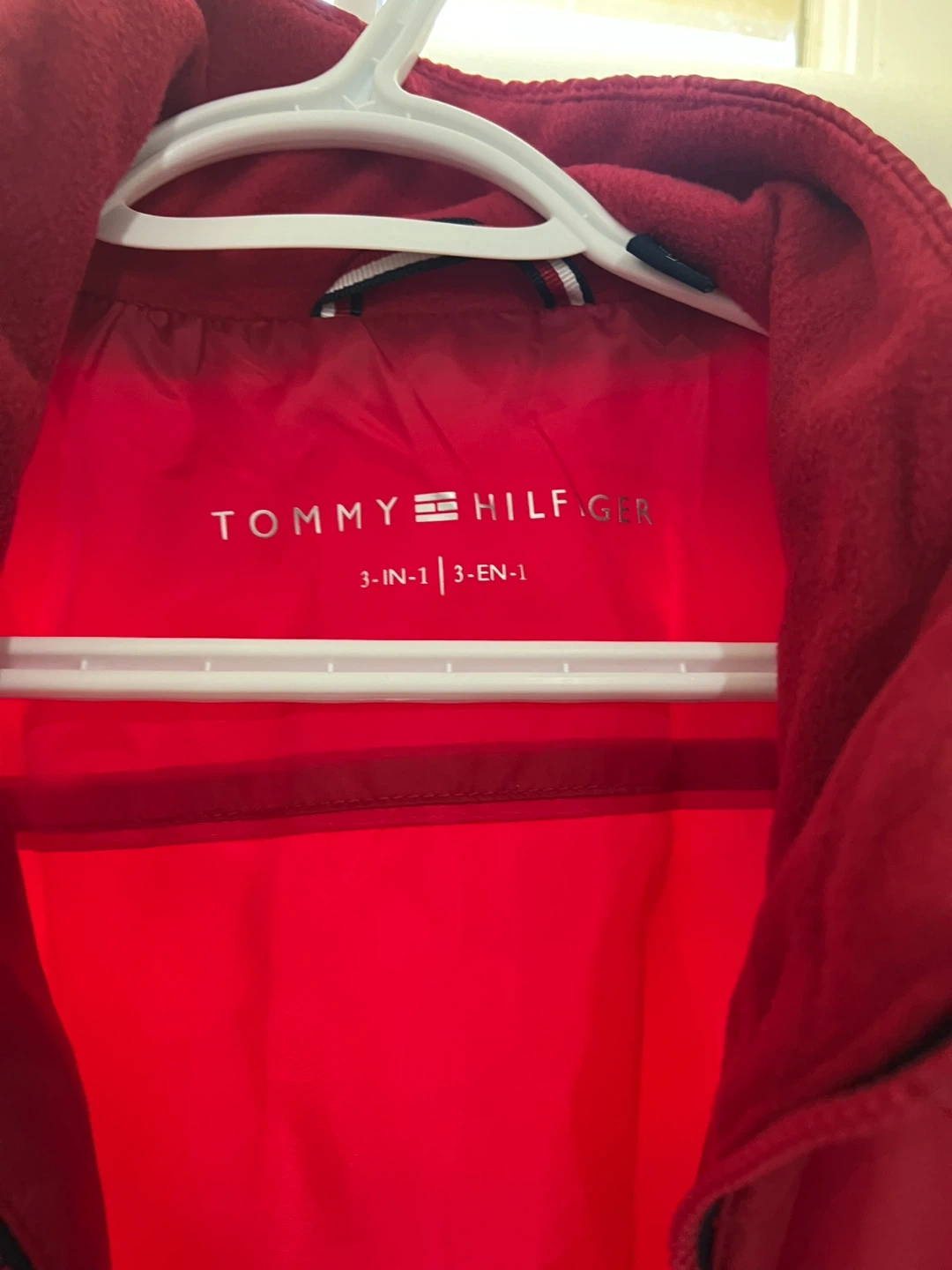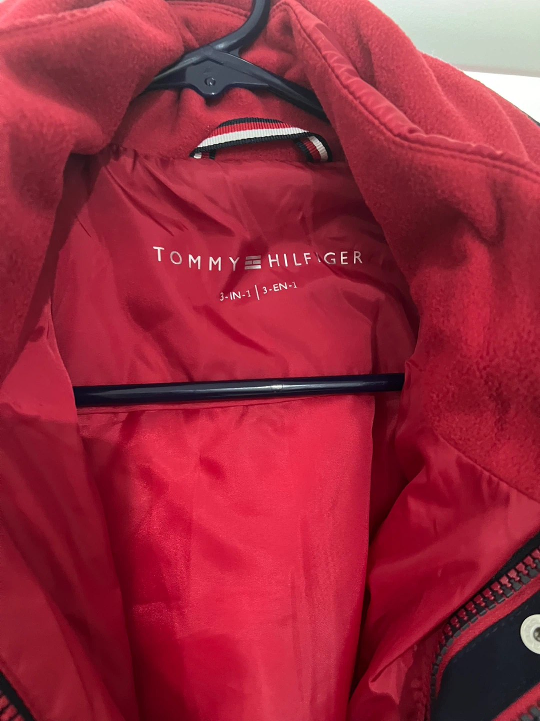 Tommy Hilfiger navy blue jacket with a removable red fleece liner. Features the signature Tommy Hilfiger flag logo patch on the sleeve. This 3-in-1 design offers versatile wear for different weather conditions. Includes adjustable waist and cuffs.
