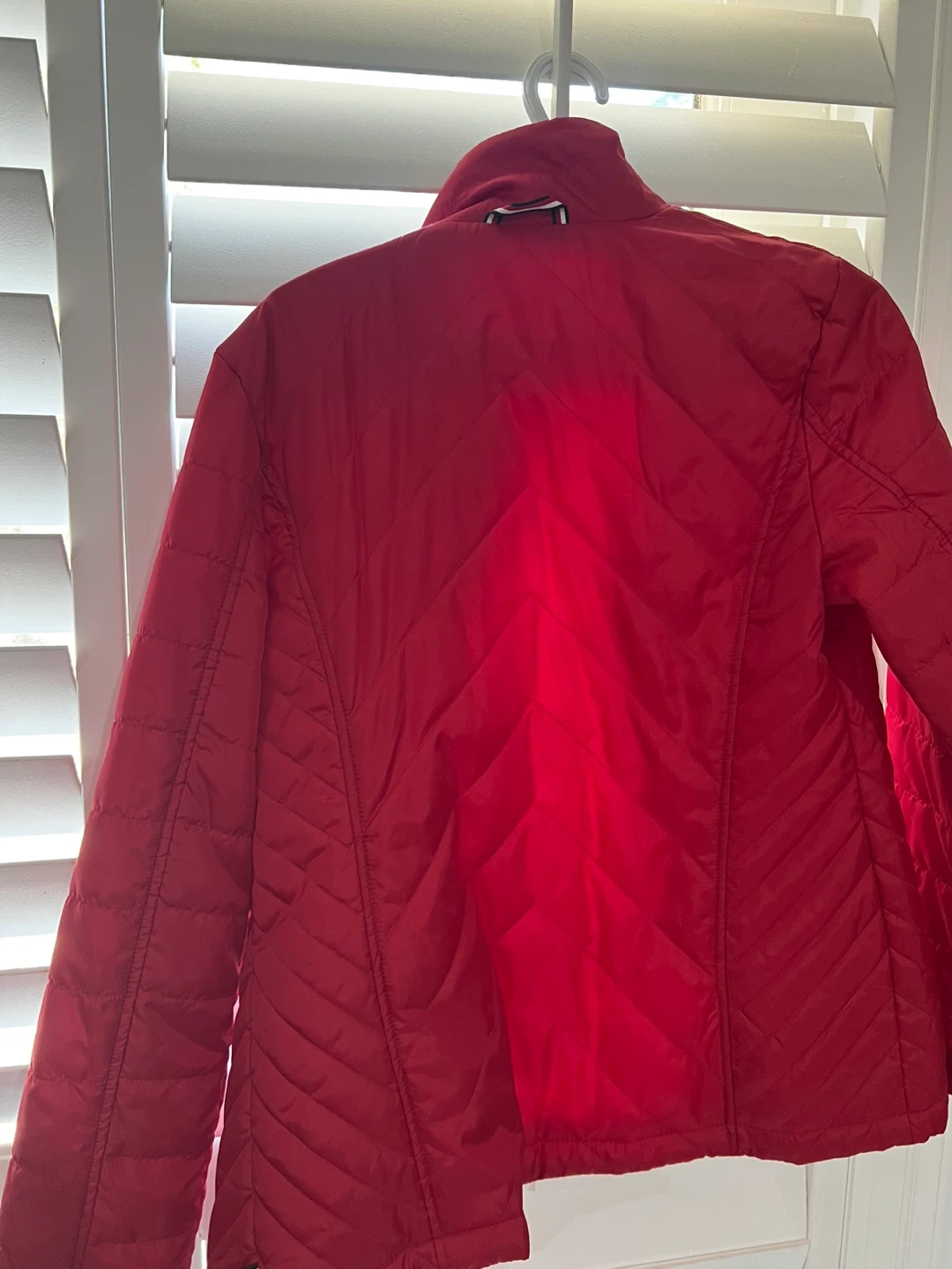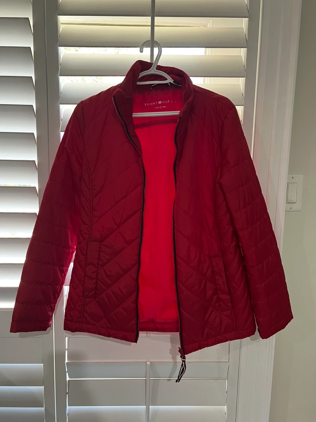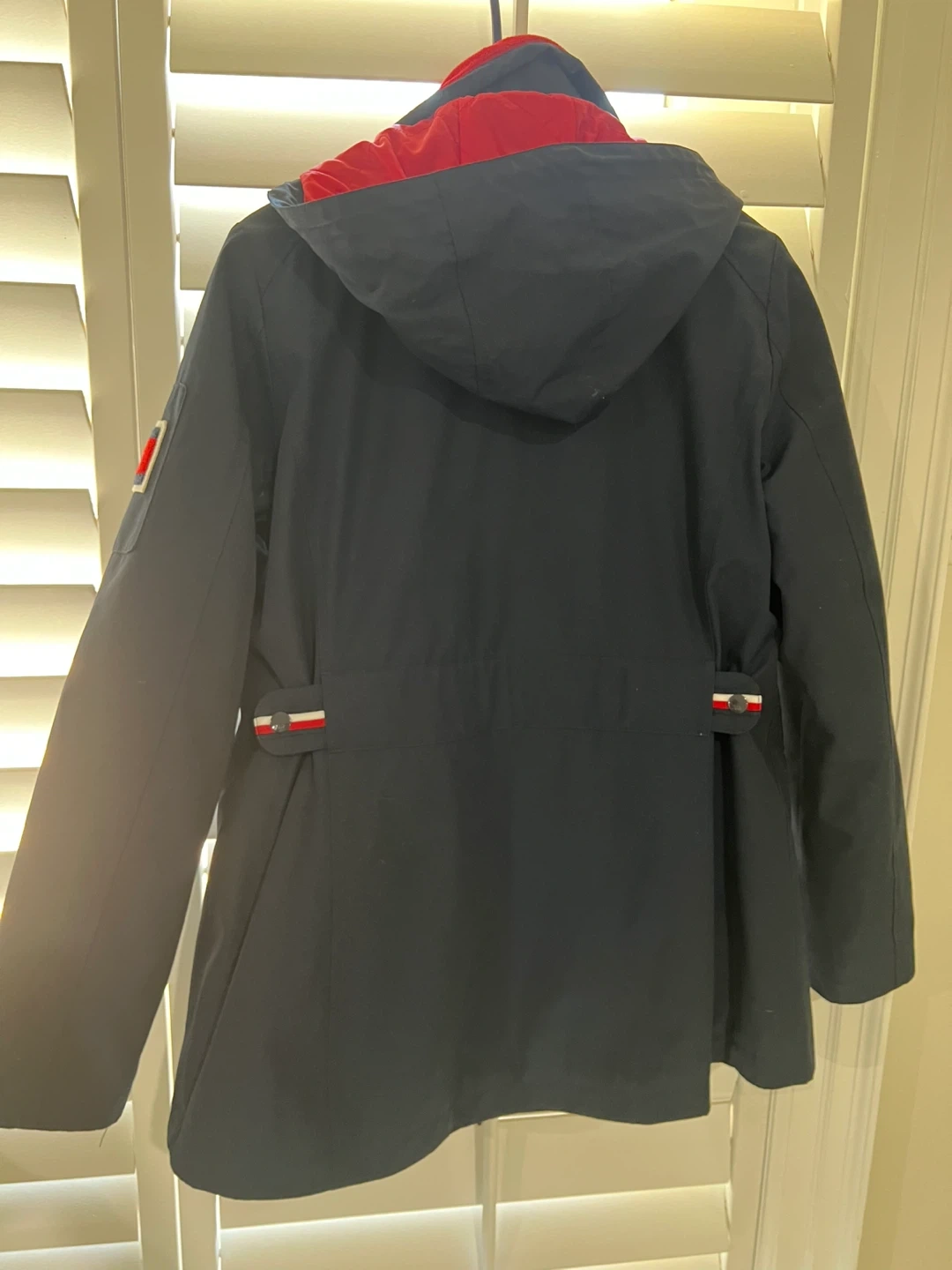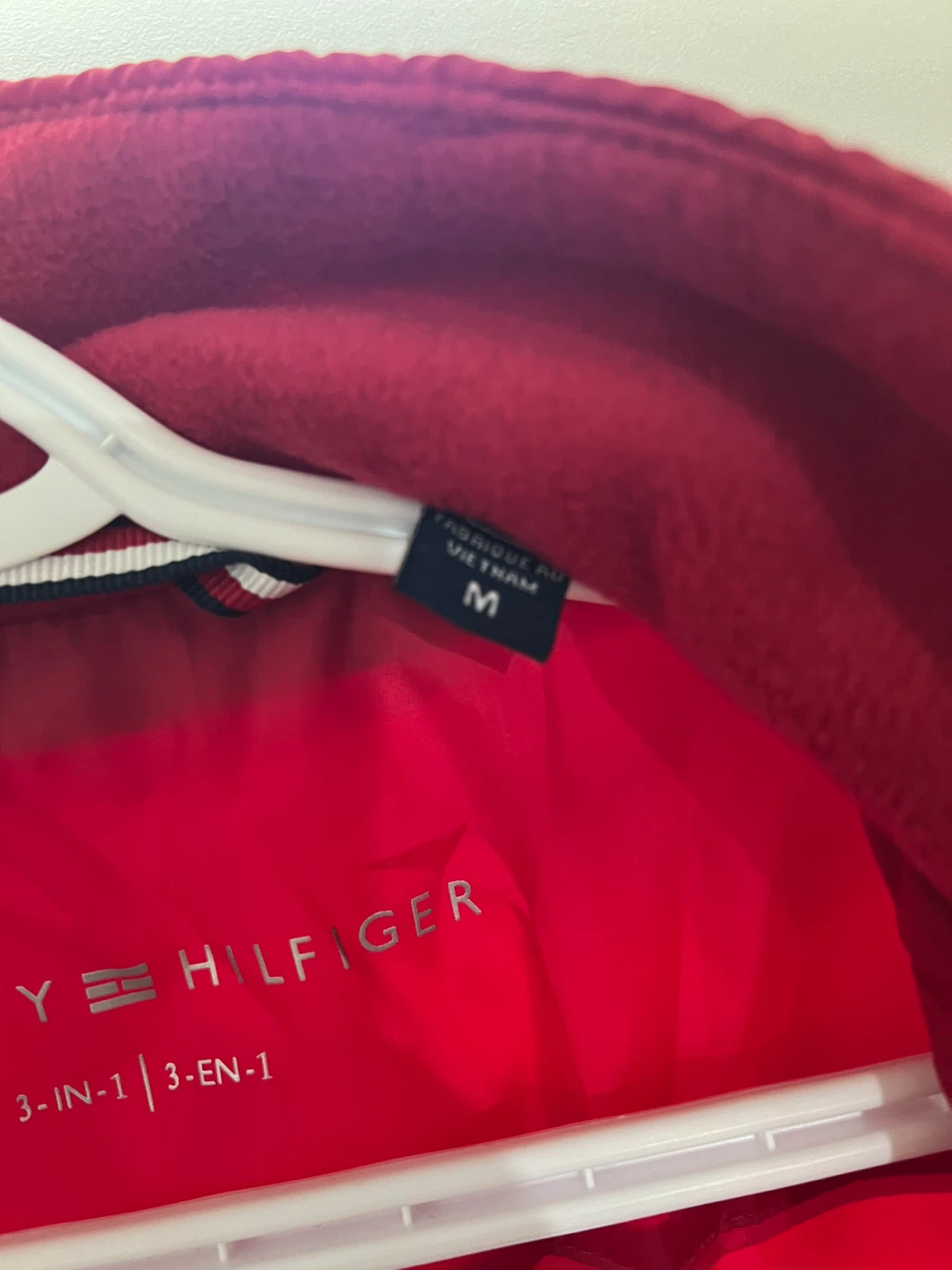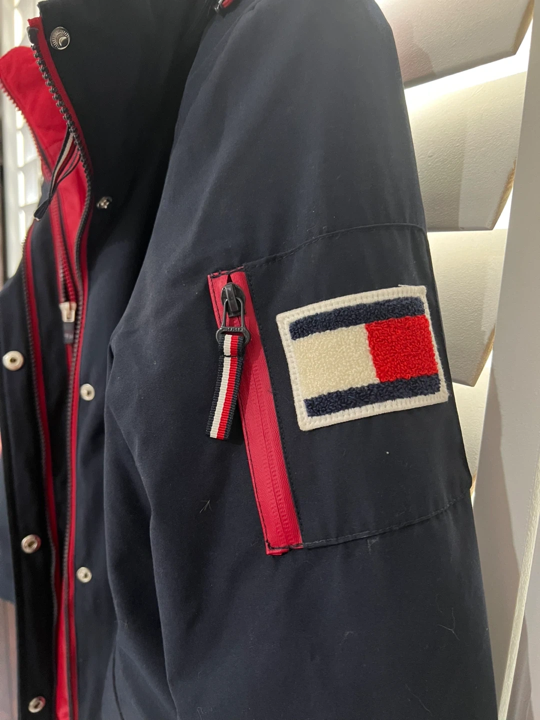 Tommy Hilfiger navy blue jacket with a removable red fleece liner. Features the signature Tommy Hilfiger flag logo patch on the sleeve. This 3-in-1 design offers versatile wear for different weather conditions. Includes adjustable waist and cuffs.
