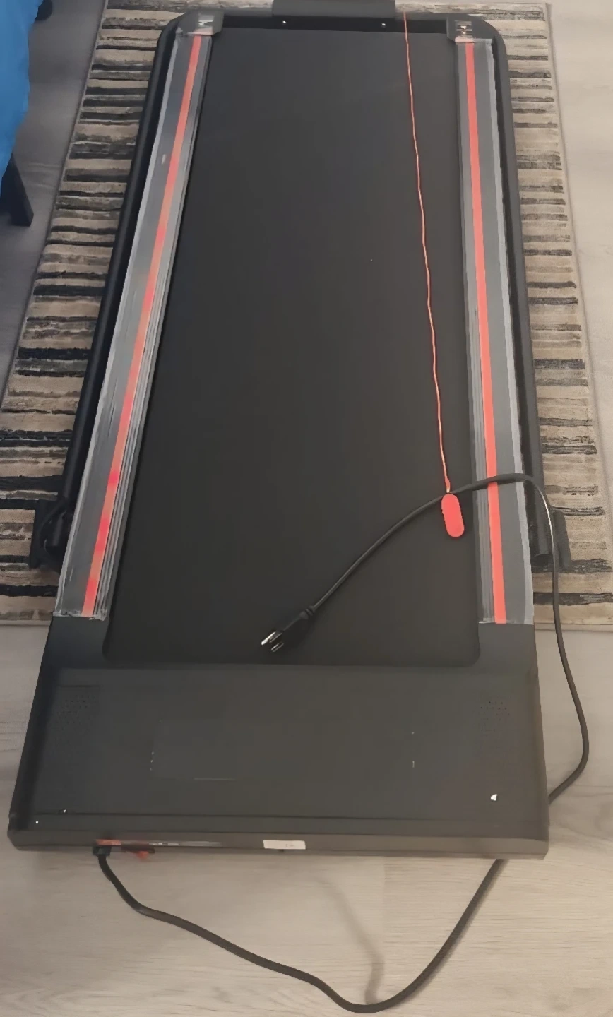 A black folding treadmill for walking or light jogging. It has a safety tether cord and red accent lights along the sides. Ready for use!