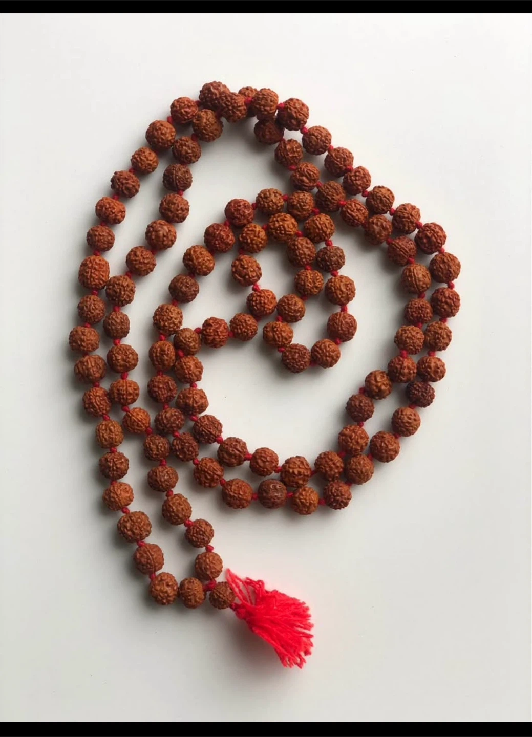 Here are some Rudraksha mala prayer beads. They are brown and strung with a red string and tassel. Perfect for meditation or prayer. The beads are of 5 faces(mukhi). Size of beads are 8 mm.