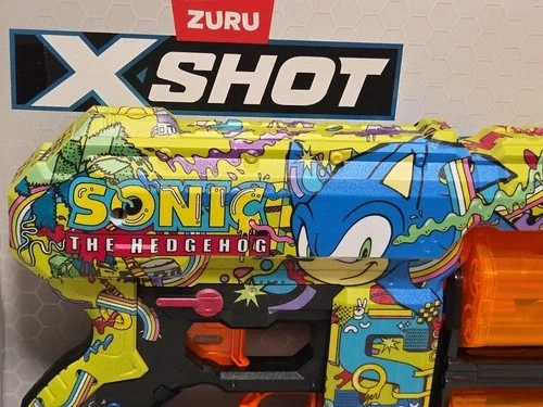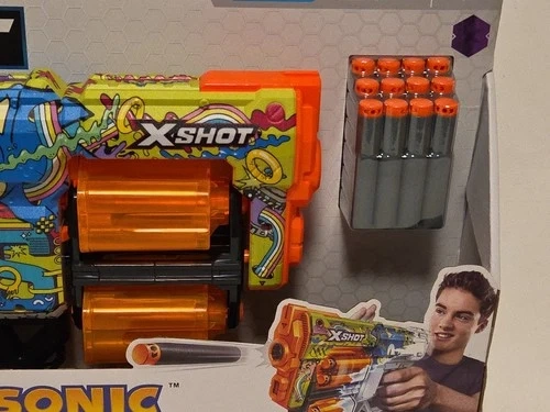 Skin your blaster with the super sonic speed of Sonic the Hedgehog! With a 12-dart capacity, the XSHOT Skins Dread's double rotating barrels mean you are locked and loaded for fun. Blast targets up to 27m / 90 feet away. Hunt for all 6 Sonic the Hedgehog Skins and find the rare blasters. Includes 1x XSHOT Skins Dread Blaster - Hyper Spike and 12x Air Pocket Technology Foam Darts. See photos for condition; good and clean! Smoke-Free Home.