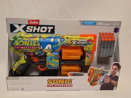 Skin your blaster with the super sonic speed of Sonic the Hedgehog! With a 12-dart capacity, the XSHOT Skins Dread's double rotating barrels mean you are locked and loaded for fun. Blast targets up to 27m / 90 feet away. Hunt for all 6 Sonic the Hedgehog Skins and find the rare blasters. Includes 1x XSHOT Skins Dread Blaster - Hyper Spike and 12x Air Pocket Technology Foam Darts. See photos for condition; good and clean! Smoke-Free Home.