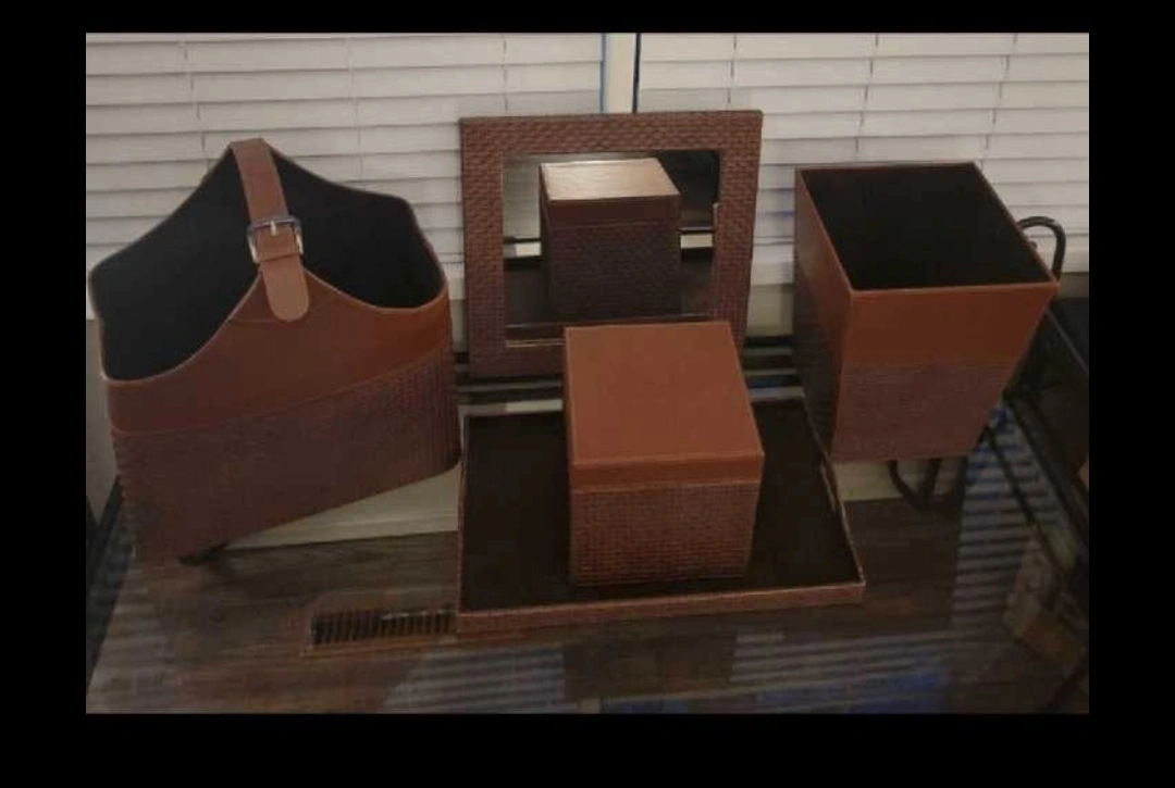 Here's a lovely set of brown home decor items. It includes a magazine rack, a square mirror, a square box, and a waste bin and tray. Perfect for adding a touch of rustic charm to your space!