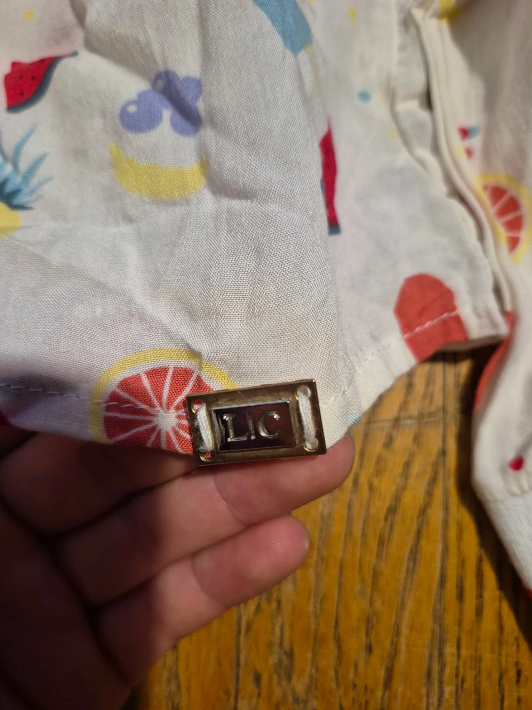 Lizette Collection women's blouse with a fun all-over fruit and popsicle print. Features red and white striped trim at the neckline and cuffs. Size medium.