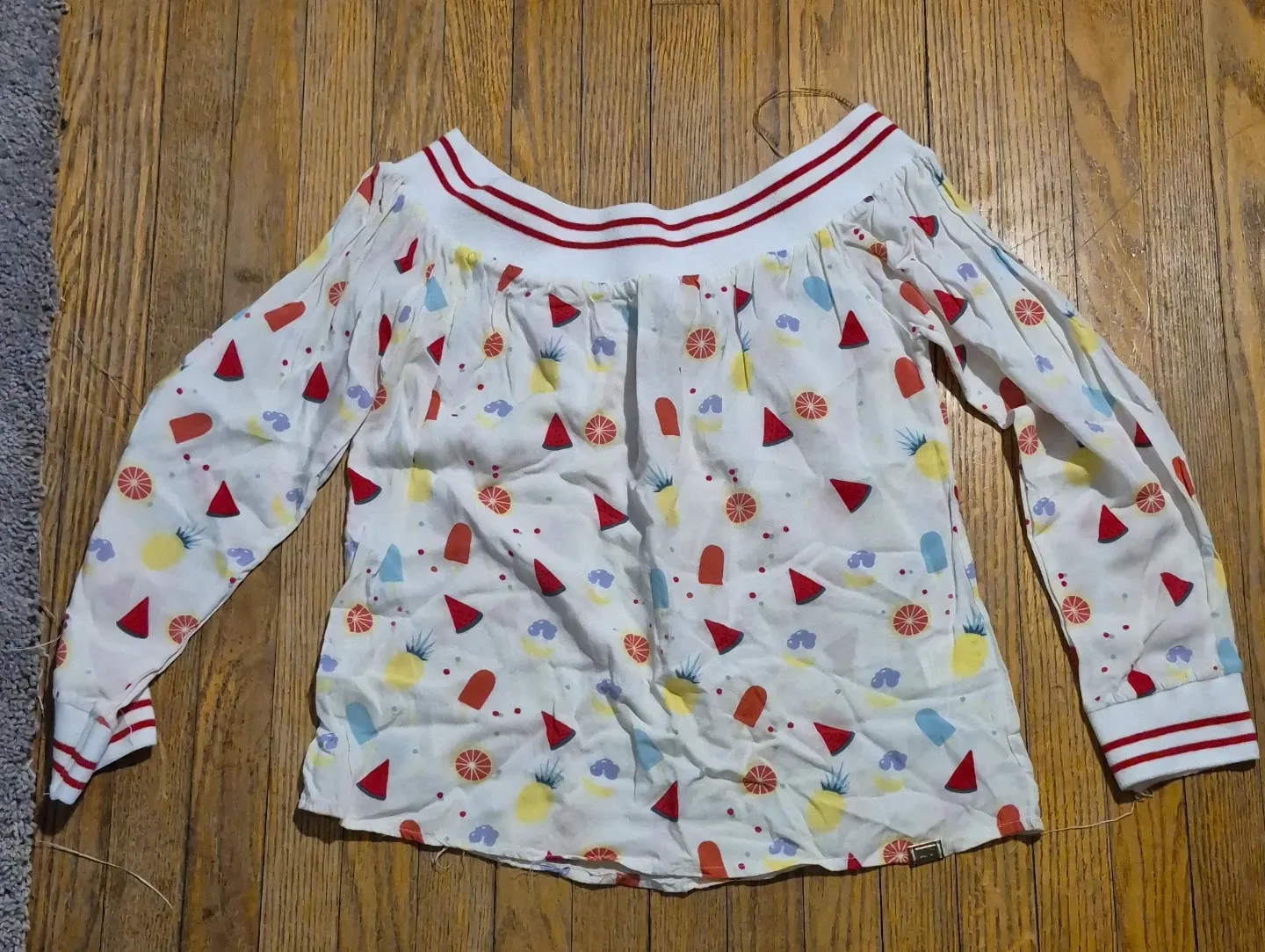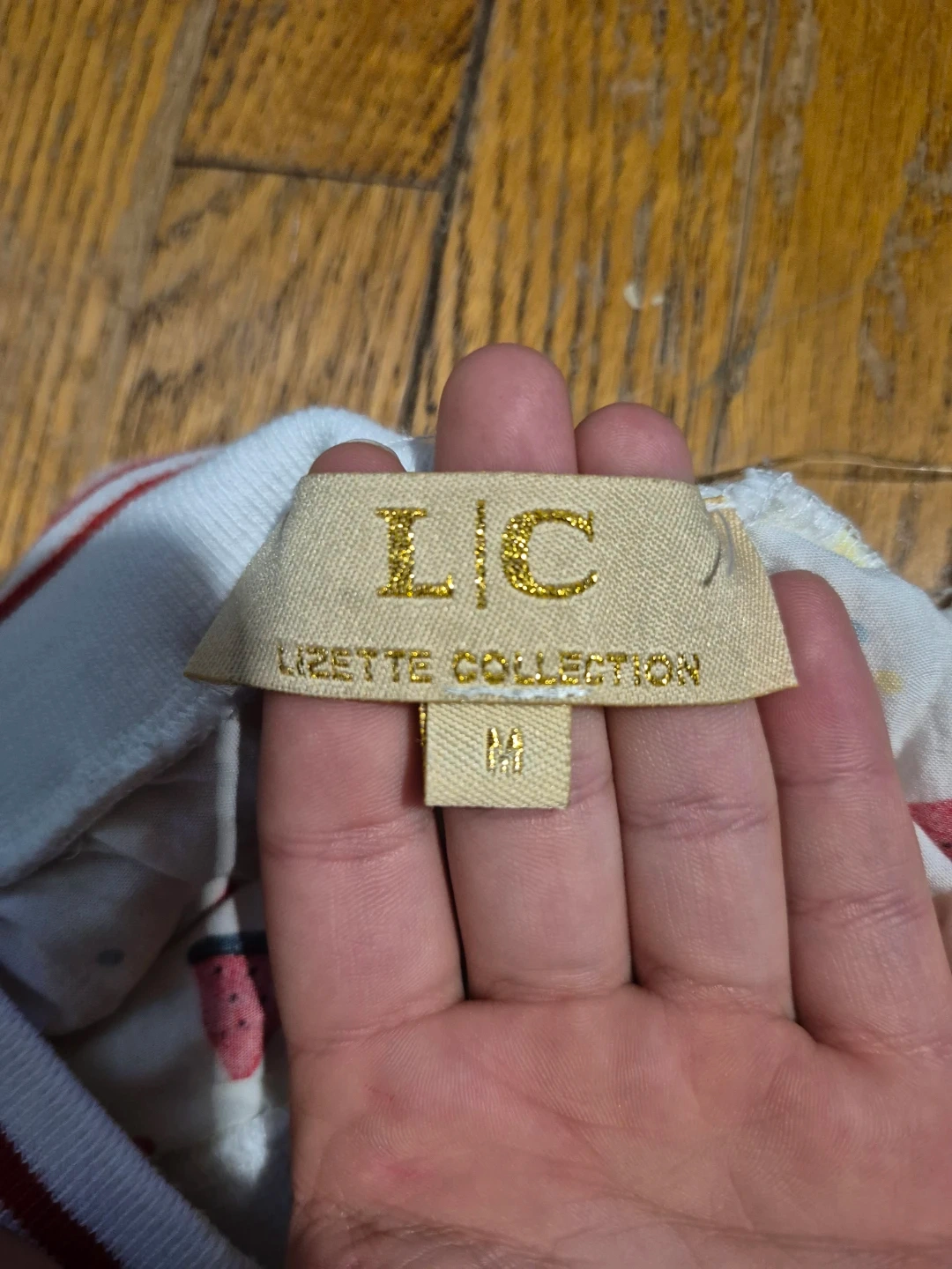 Lizette Collection women's blouse with a fun all-over fruit and popsicle print. Features red and white striped trim at the neckline and cuffs. Size medium.