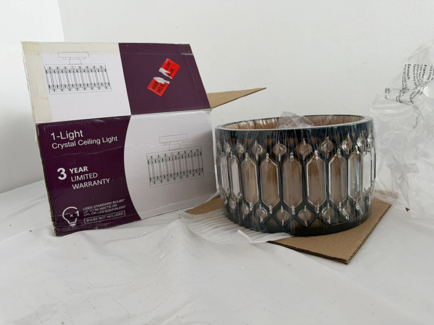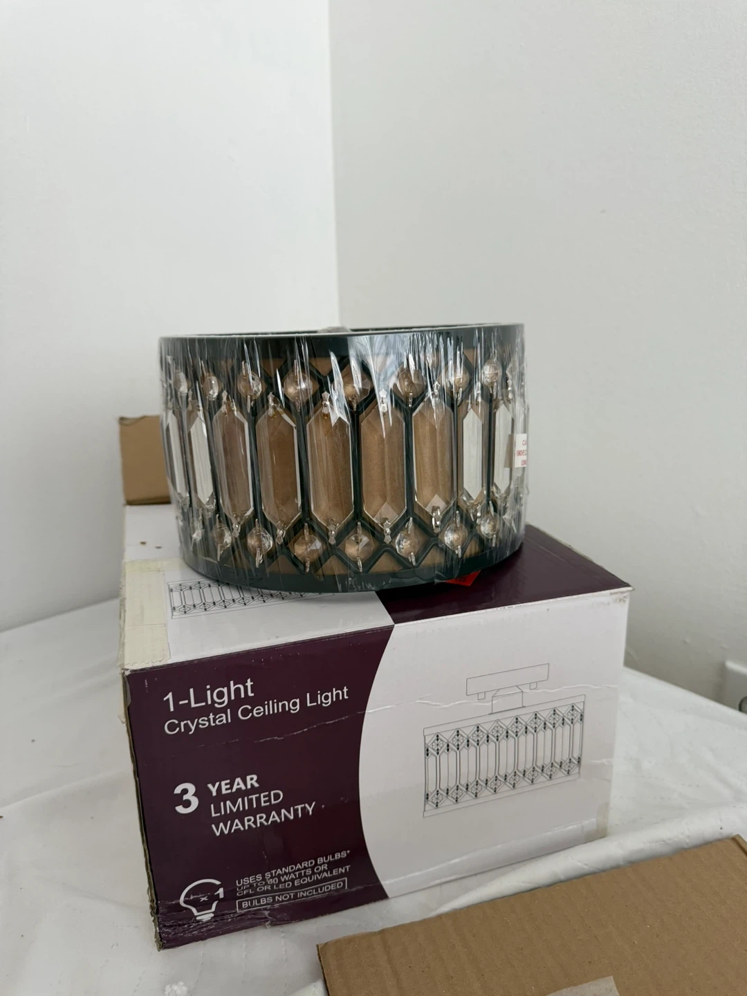 Selling a brand new 1-Light Crystal Ceiling Light! The box includes a 3 year limited warranty. It uses standard bulbs up to 60 watts or CFL or LED equivalent, but bulbs are not included. The dimensions are 4.7 in W (12 cm AN) x 7.7 in H (19.5 mm AN) x 8.7 in W (22 cm AN).