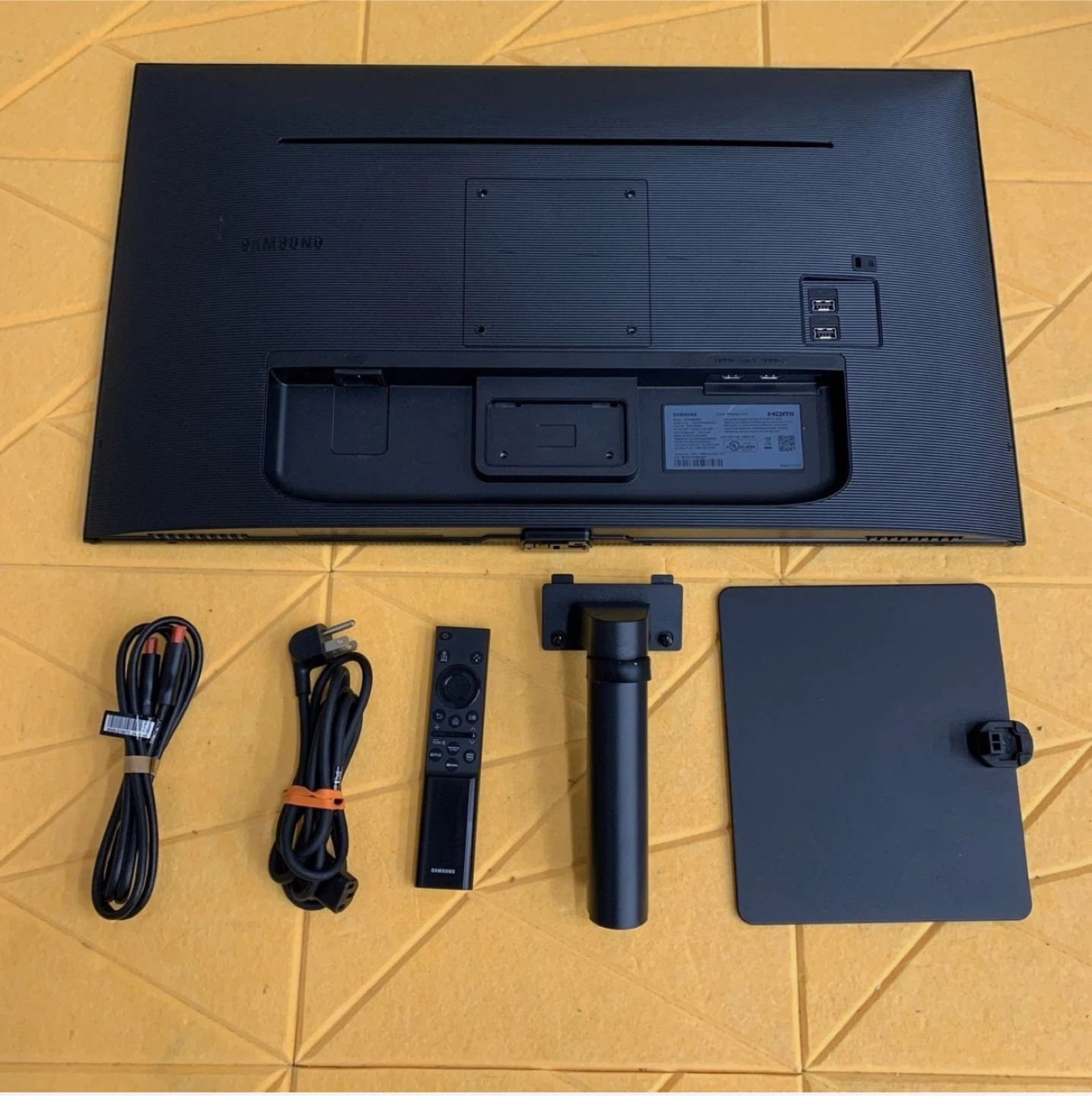 This is a Samsung Smart TV. It's black and comes with a remote, power cable, stand, and mounting hardware. It's ready for viewing!