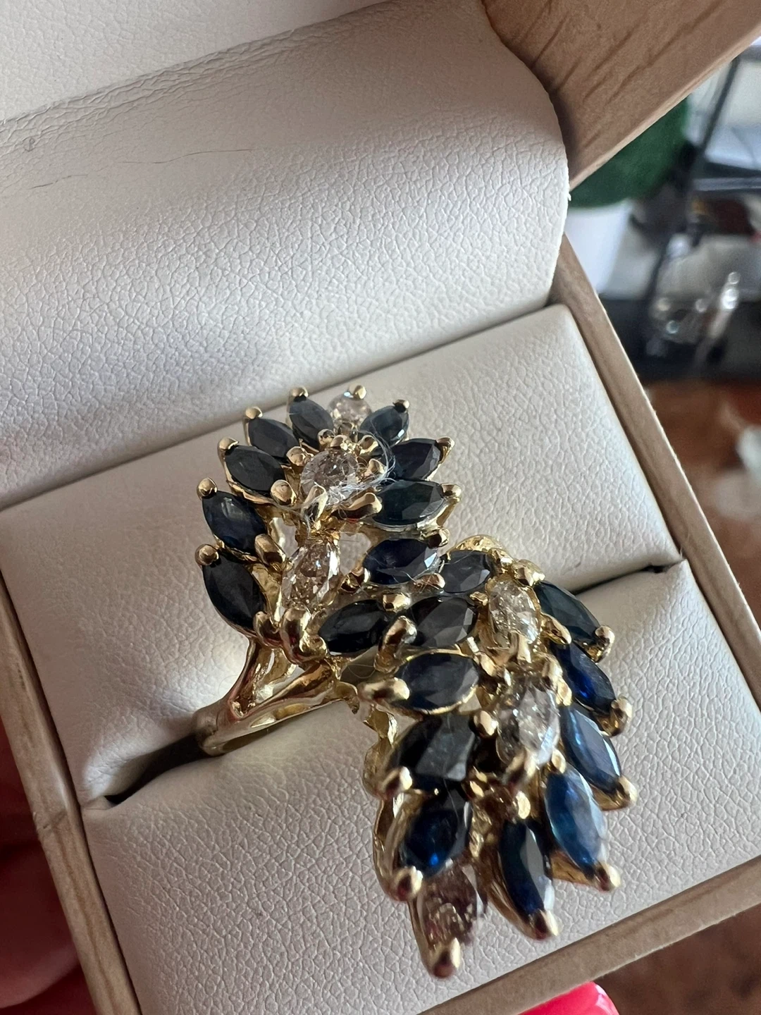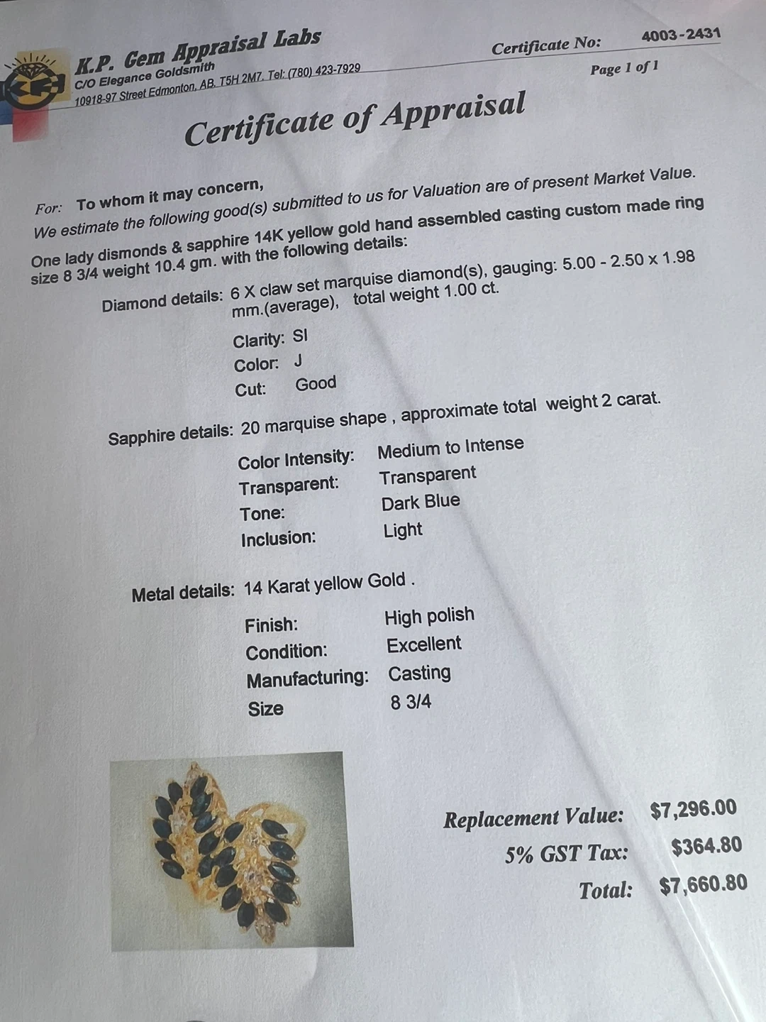 Lady's diamond & sapphire 14K yellow gold ring. Features 20 marquise shape sapphires and 6 claw set diamonds, totalling approximately 2 carats in sapphires and 1.00 carat in diamonds. Casting manufacturing, high polish finish.