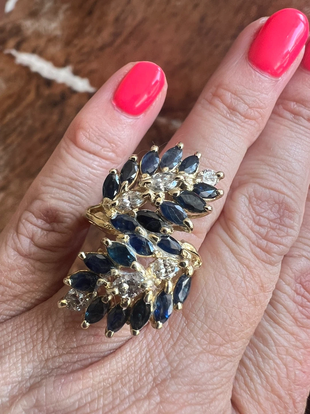 Lady's diamond & sapphire 14K yellow gold ring. Features 20 marquise shape sapphires and 6 claw set diamonds, totalling approximately 2 carats in sapphires and 1.00 carat in diamonds. Casting manufacturing, high polish finish.