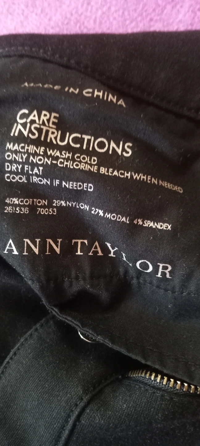Ann Taylor black pants made from a blend of cotton, nylon, modal, and spandex. They are machine washable and dry flat. These pants offer a comfortable fit.
