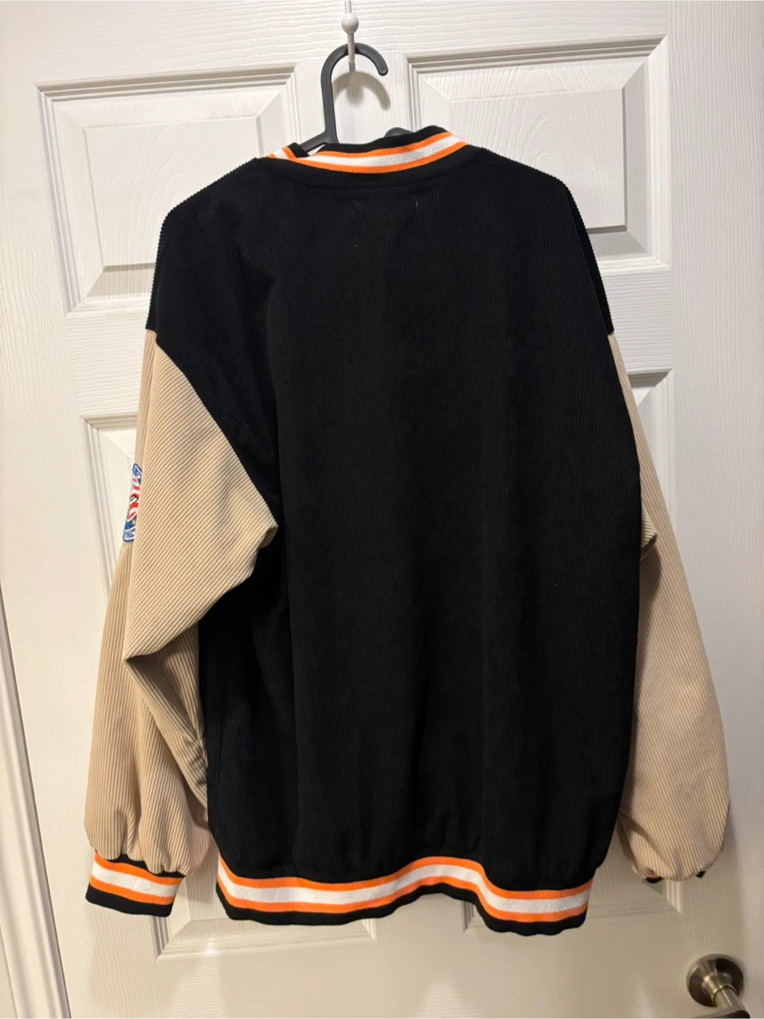 Black corduroy bomber jacket with tan sleeves. Features embroidered patches and a satin lining. Ribbed cuffs and hem. This jacket is great for cooler weather!