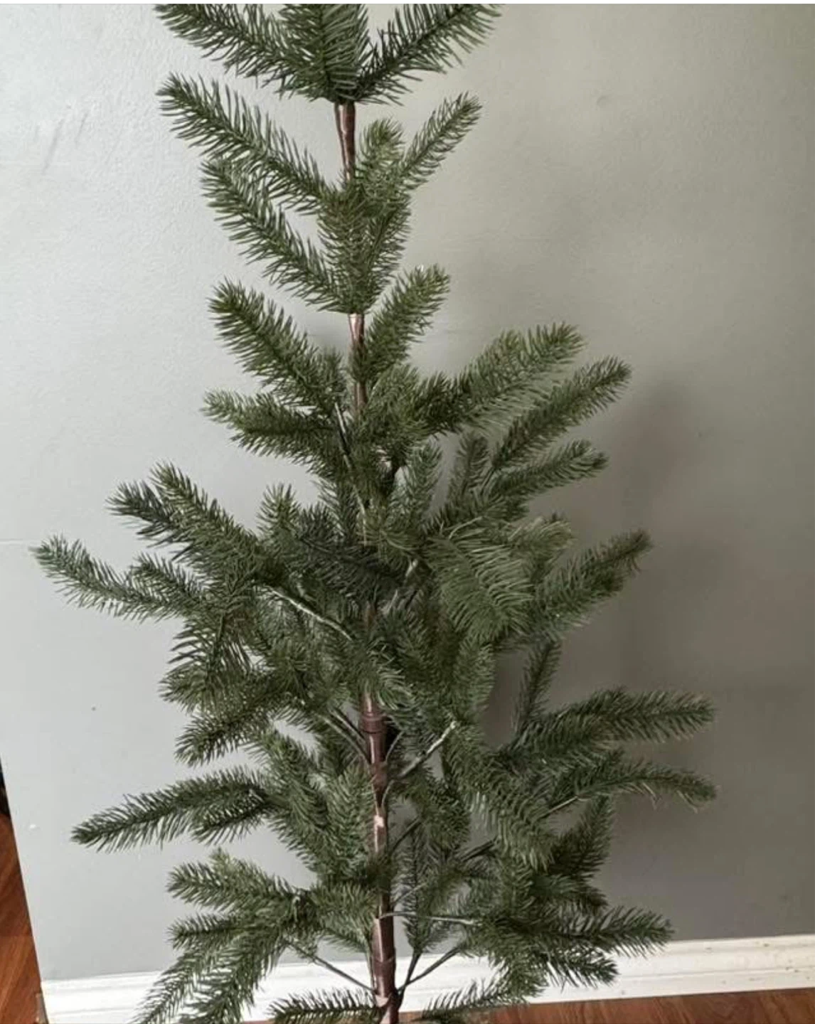 A simple artificial Christmas tree with green branches. It's made of plastic and metal. Perfect for setting up your holiday decorations!