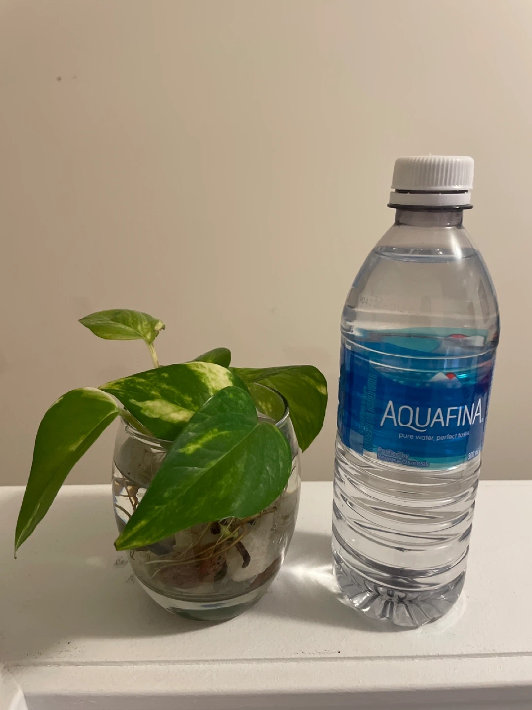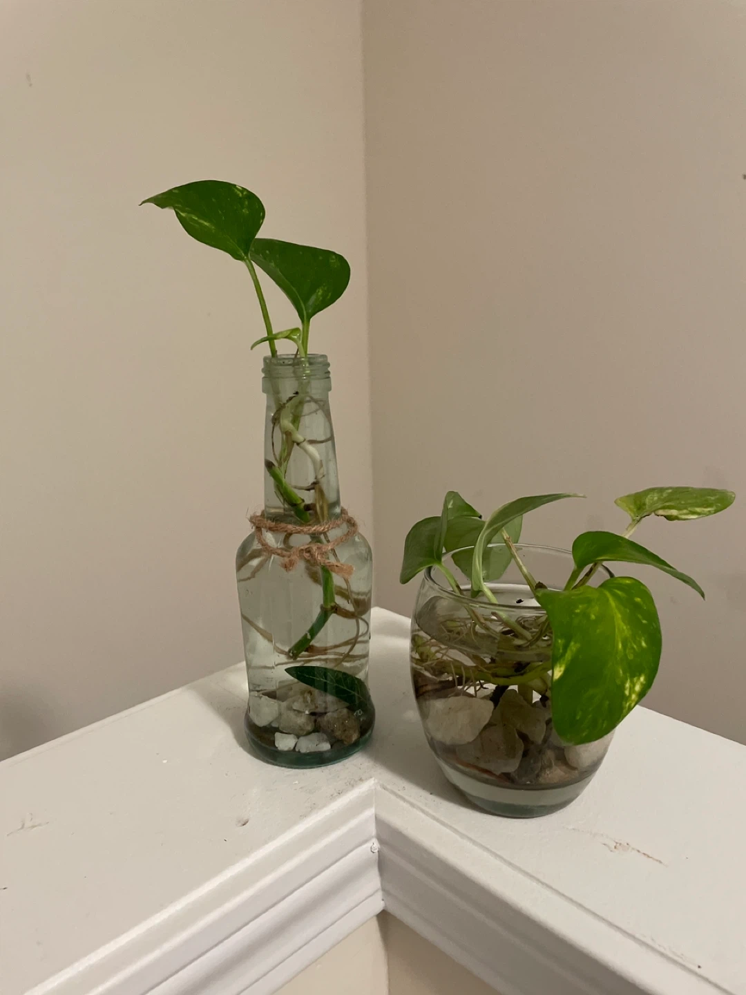 Pothos cuttings rooting in water. Each cutting is in a unique glass vase with stones. One vase is a clear bottle, the other is a rounded glass. Perfect for adding some greenery to your space!