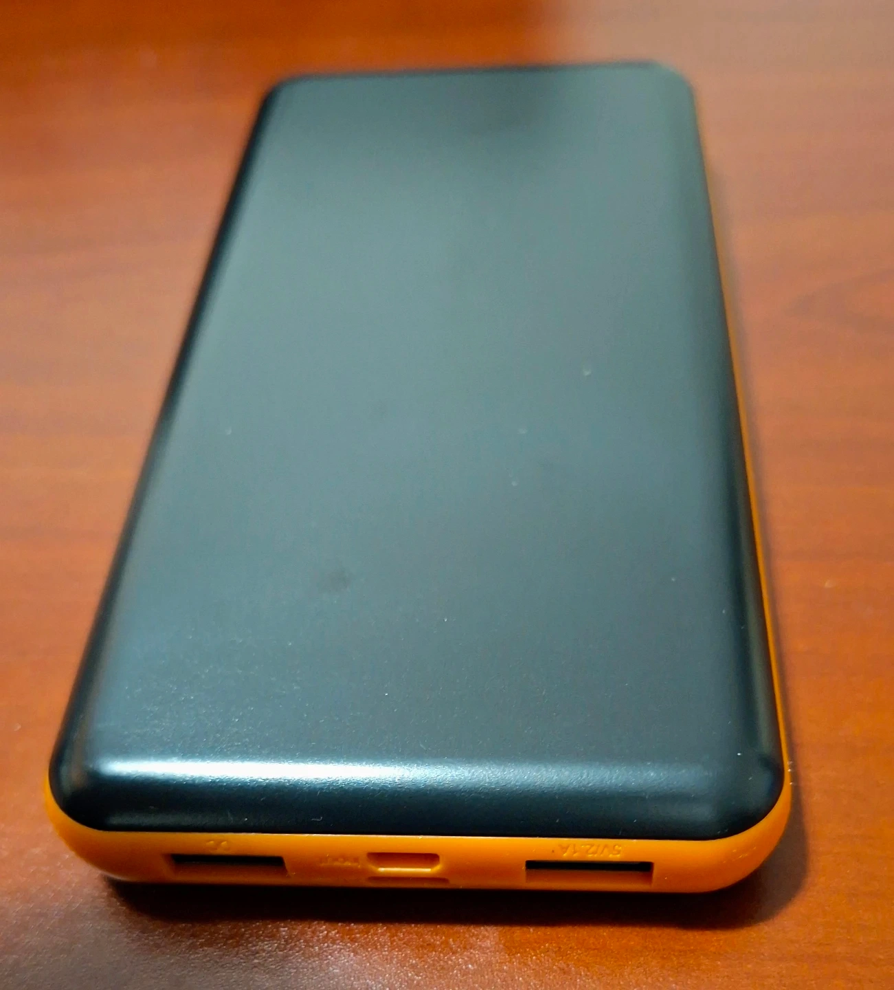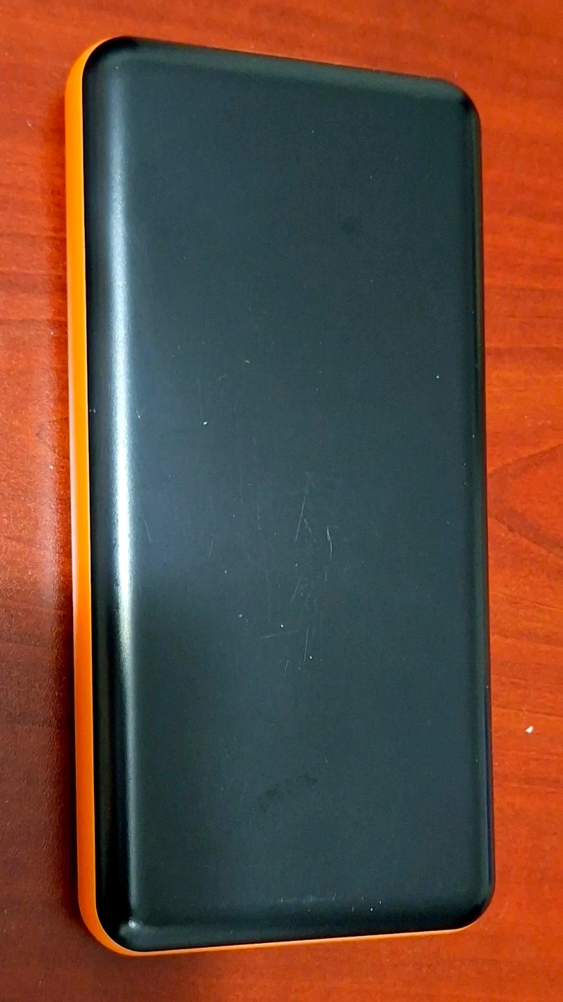 A black and orange power bank is available. It has multiple USB ports for charging devices. This power bank is useful for keeping your electronics charged on the go.