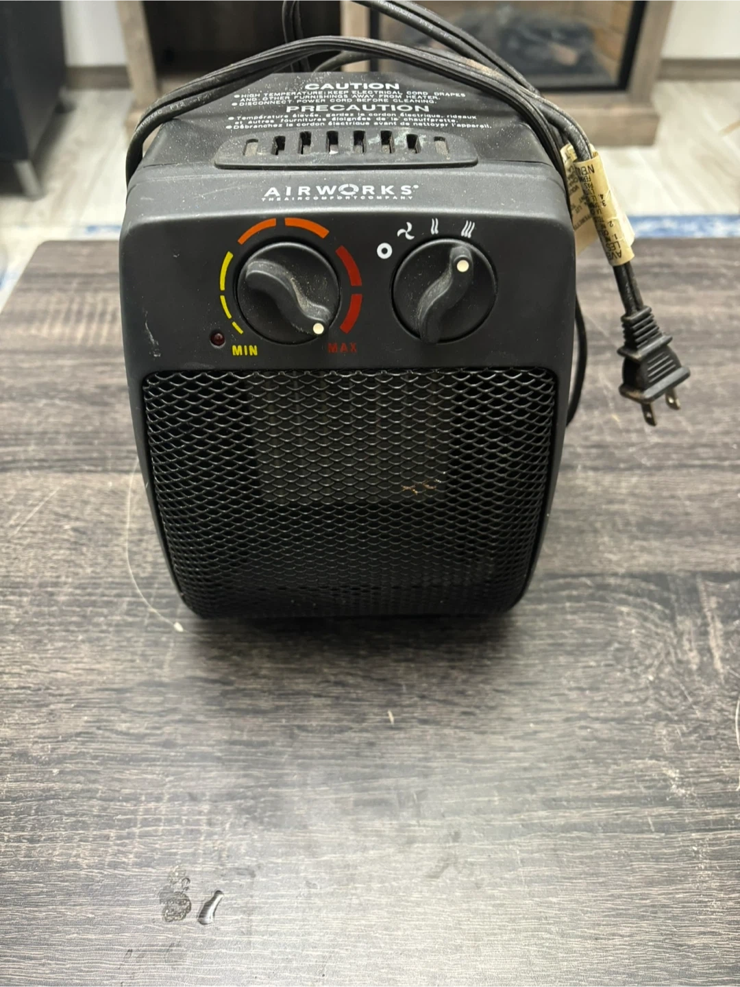 This is an Airworks portable electric heater. It has adjustable temperature settings with a heat selector dial. It's perfect for quickly warming up small spaces.