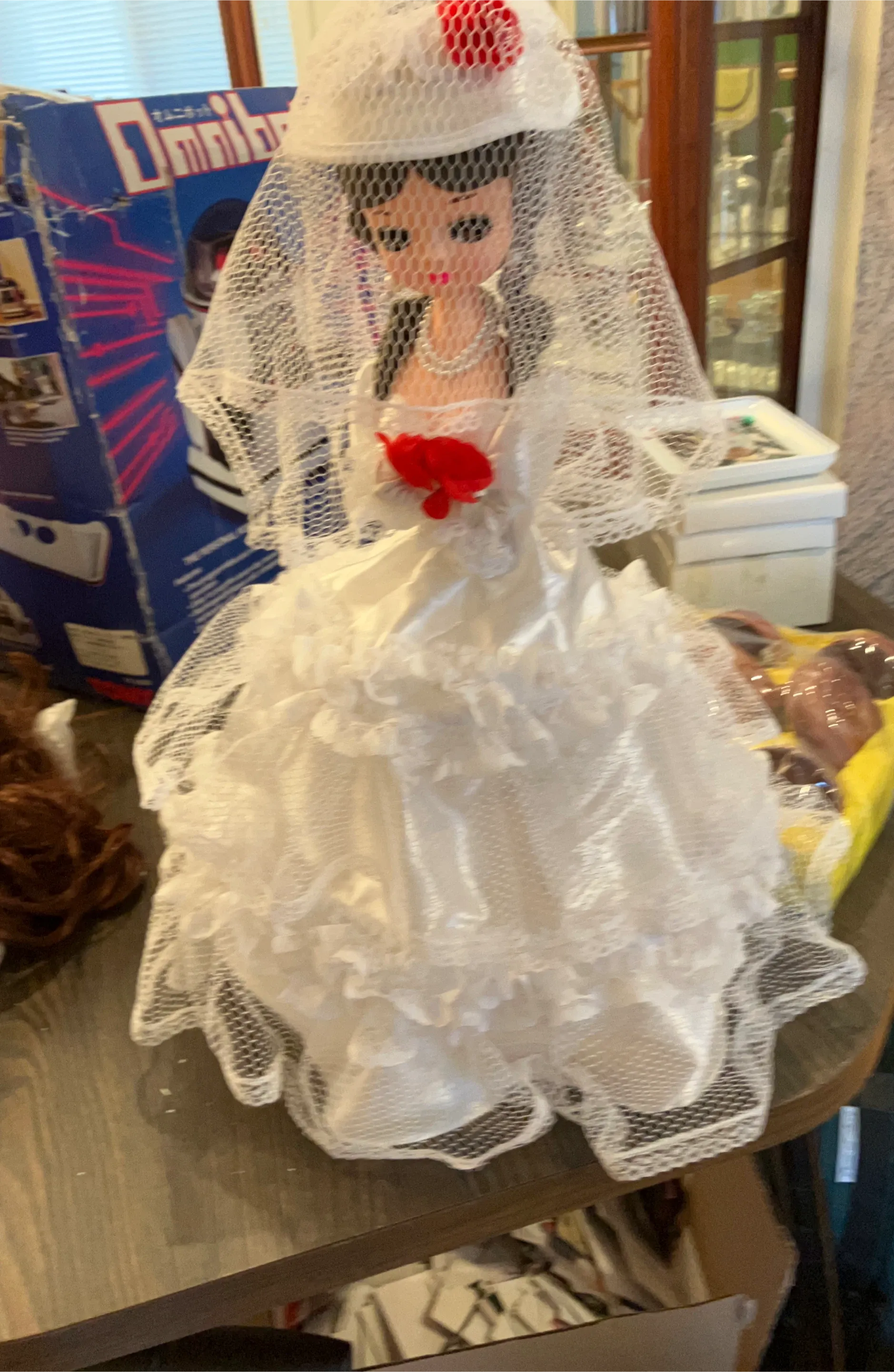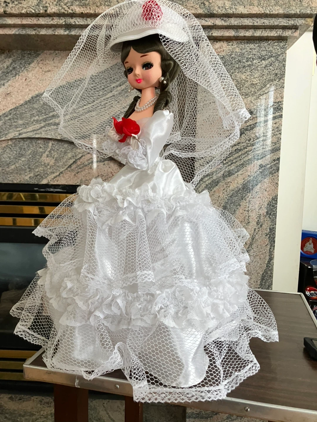 Public Meet Up-Open To Offers/CASH ONLY, This is a brand new vintage bride doll wearing a white wedding dress with lace and ruffles. It has a veil and a red accent on its hat and dress.