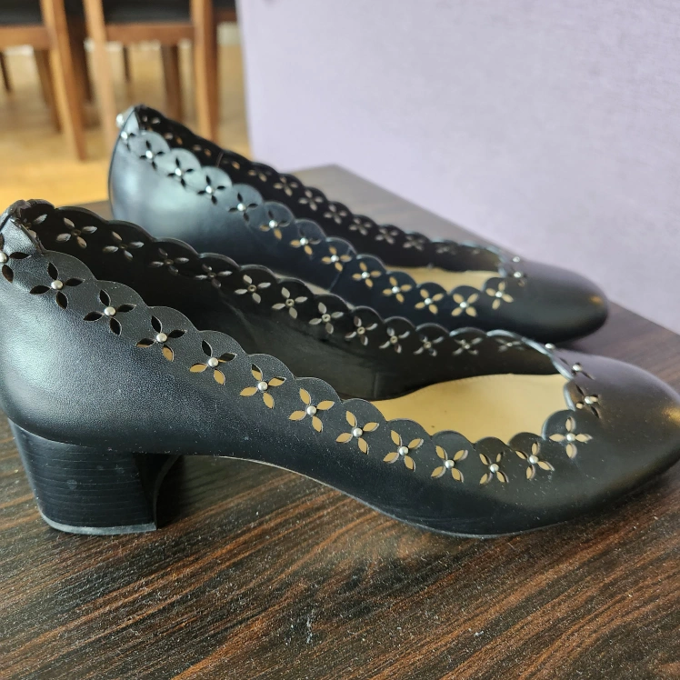 Black flats with decorative edges. Features openwork designs. Perfect for a nice stroll.