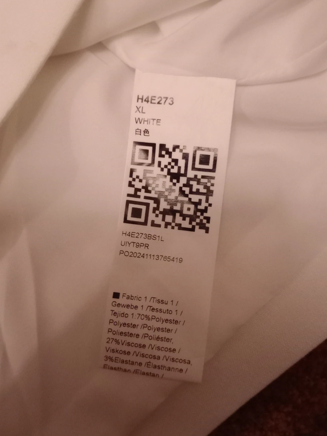 This is a white blazer, perfect for completing any look. According to the tag, the blazer is an extra large, and made of 70% polyester, 27% viscose, and 3% elastane.