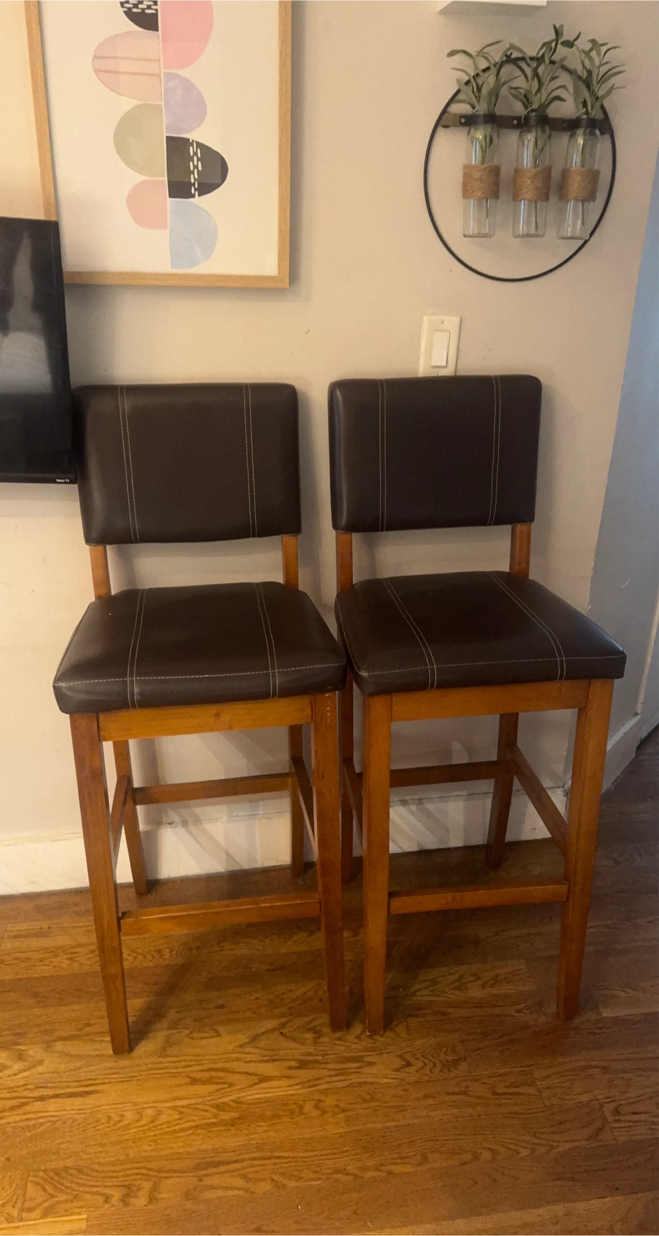 This set includes two bar stools with brown faux leather seats and backs. The wood frames offer a sturdy base. These stools are perfect for a kitchen island or home bar.