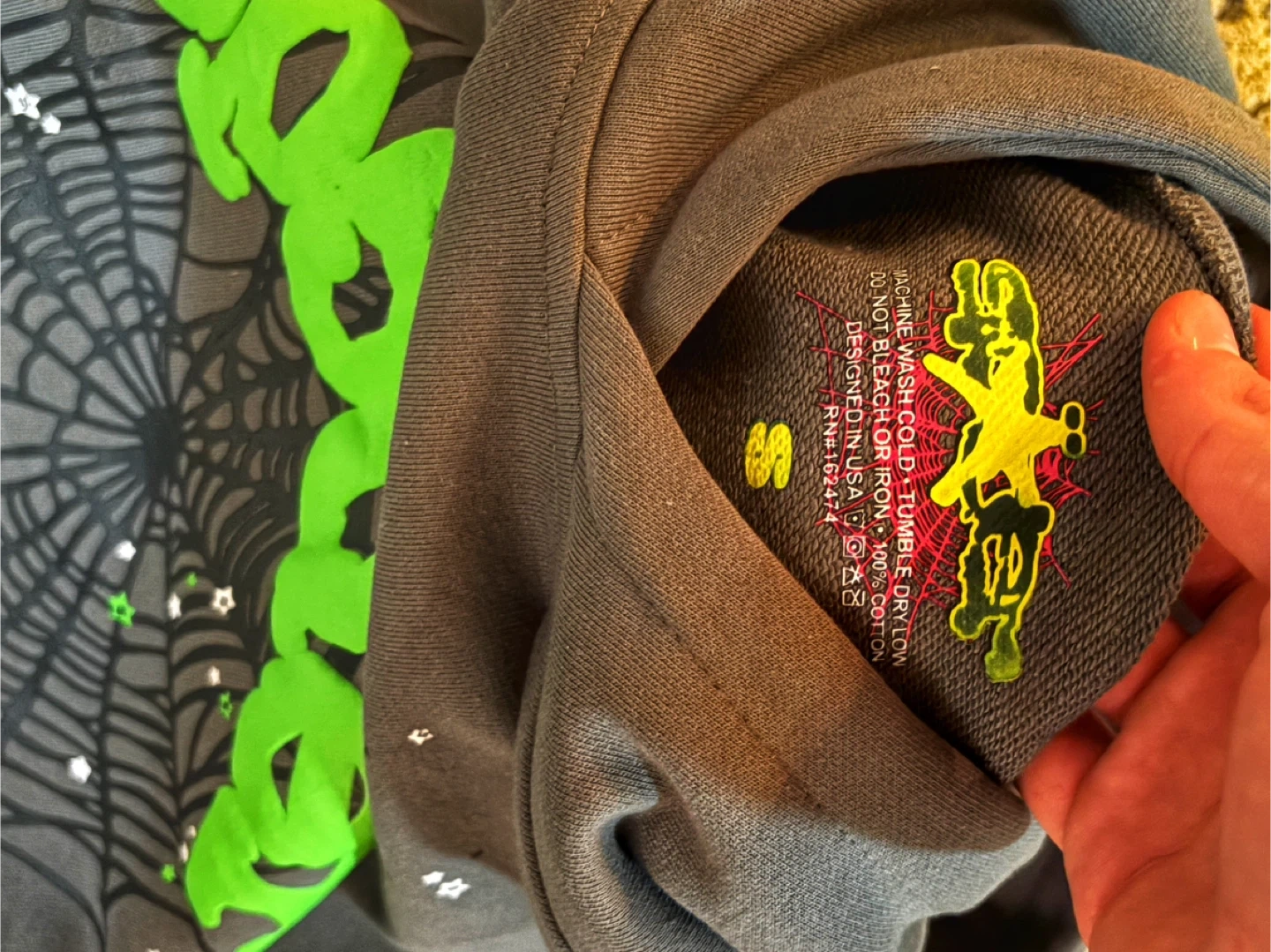 Selling a grey Sp5der hoodie. It's made of 100% cotton and is in great condition. It features a cool spiderweb design on the front. Machine wash cold and tumble dry low