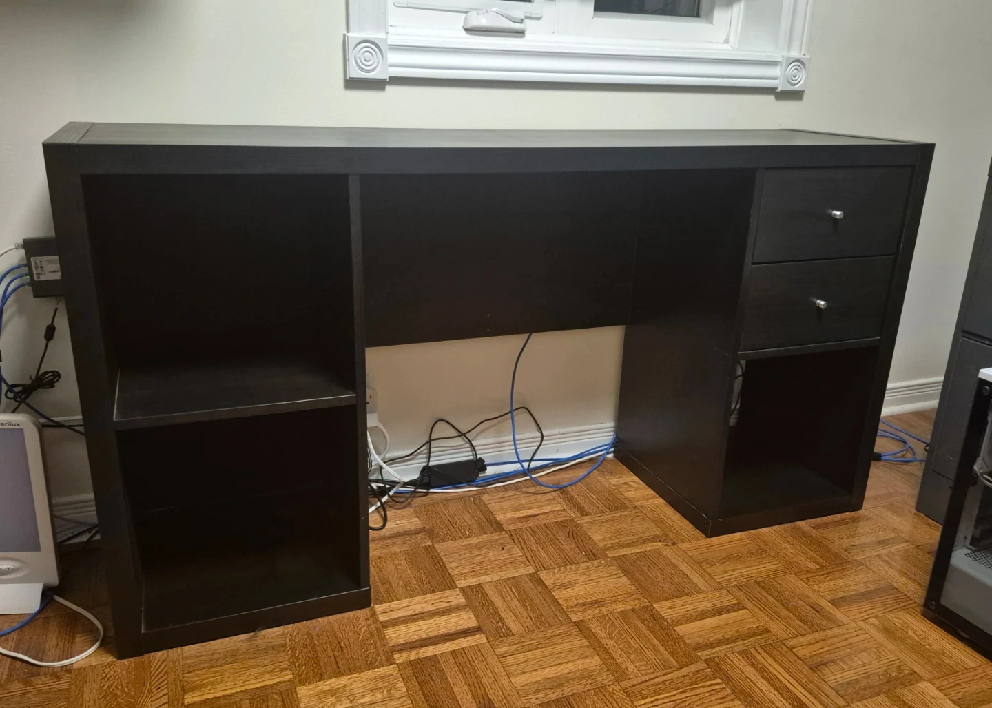 This desk features open shelving on one side and two drawers on the other for storage. It's a sturdy piece, perfect for a home office or study area. Some minor wear is visible on the edges.