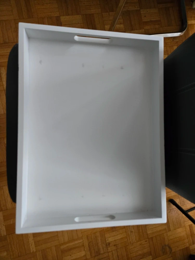 This is a lovely white serving tray, perfect for breakfast in bed or carrying drinks to the patio. It's in good condition, ready for a new home!