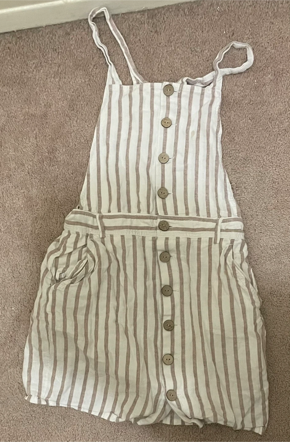 Super cute tan and white vertical striped dress with functional wooden buttons down the front. Features a square neck and comfortable wide straps. Very similar to styles from Old Navy/H&M. Perfect for summer, beach days, or layering over a white t-shirt.