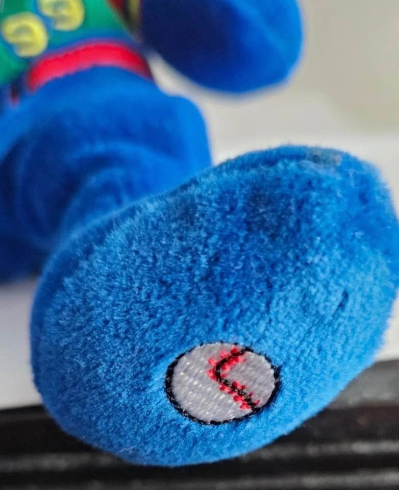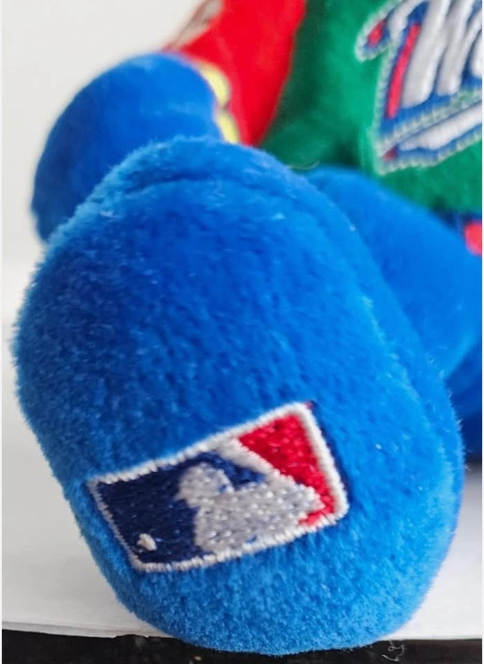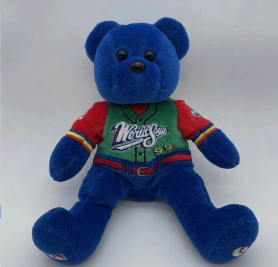 This bear is a 1999 World Series Major League Baseball bear, featuring the colors of the New York Yankees VS Atlanta Braves. Yankees defeated Braves, the 3rd of 5 World Series titles for Jeter. 25th World Series Title for Yankees. Officially licensed by MLB, this 8-inch bear is a must-have for fans of the team and the sport of baseball. This collectible item commemorates the team's victory in the 1999 World Series, making it a valuable piece for any sports memorabilia collection. The tag on the bear has been removed. This bear is in very good condition and comes in a plastic case.