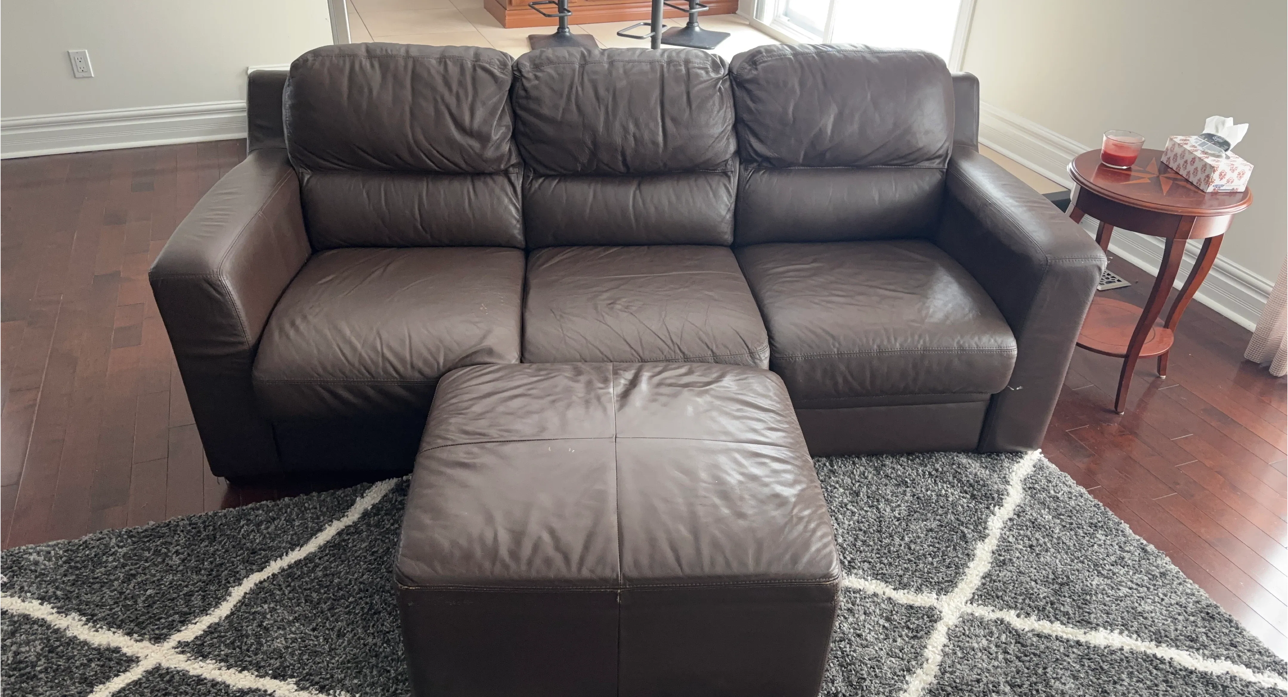 Brown leather sofa with a matching ottoman. It's a three-seater couch made of genuine leather. The set offers comfortable seating for your living room.