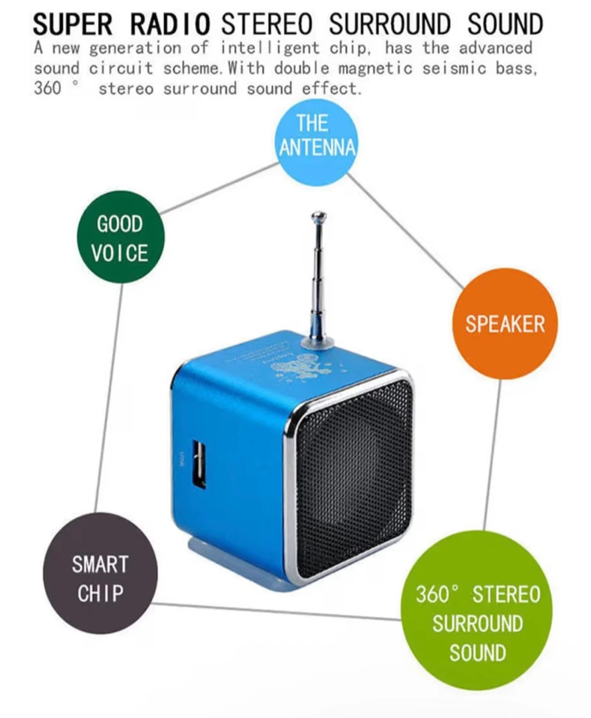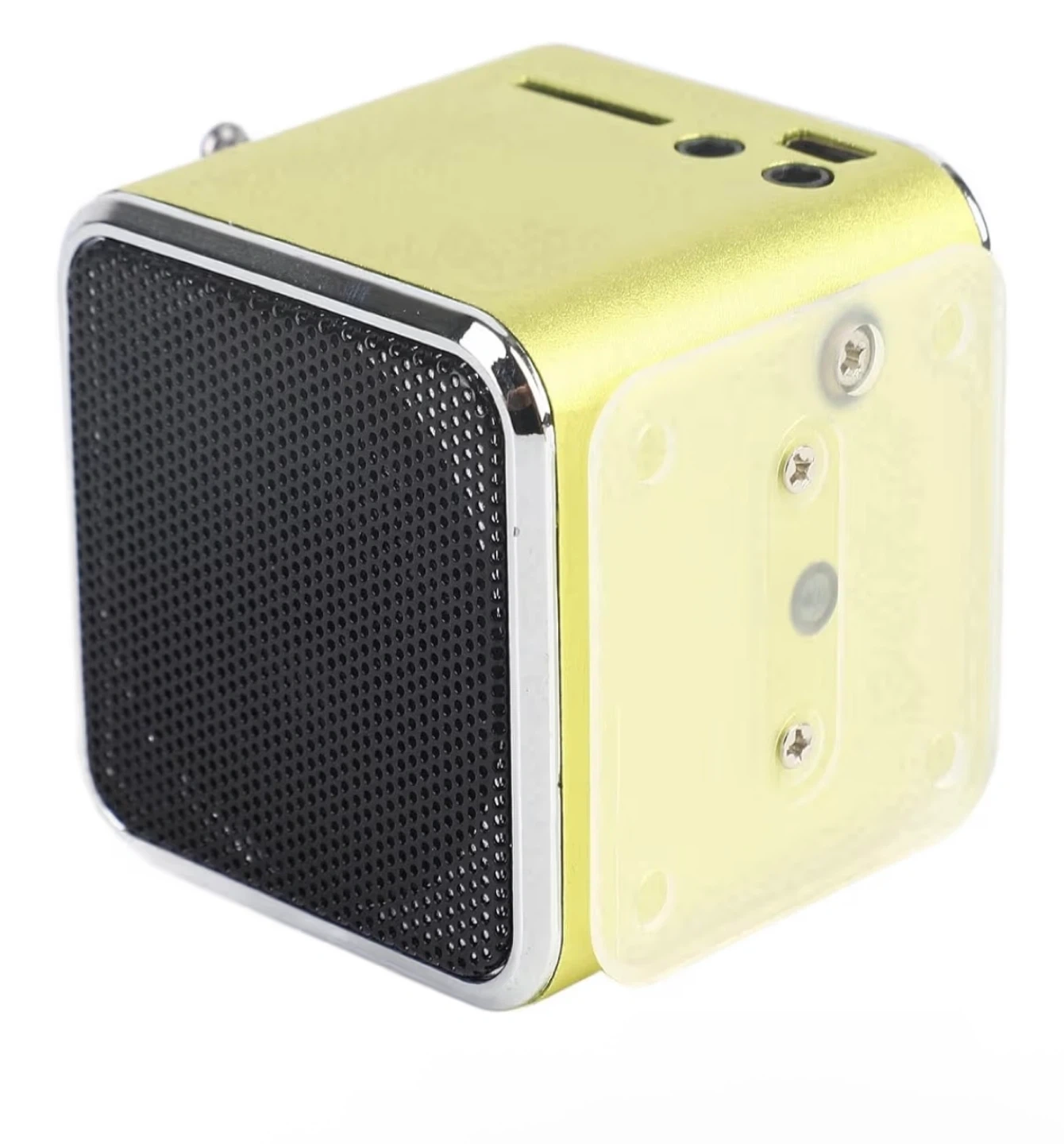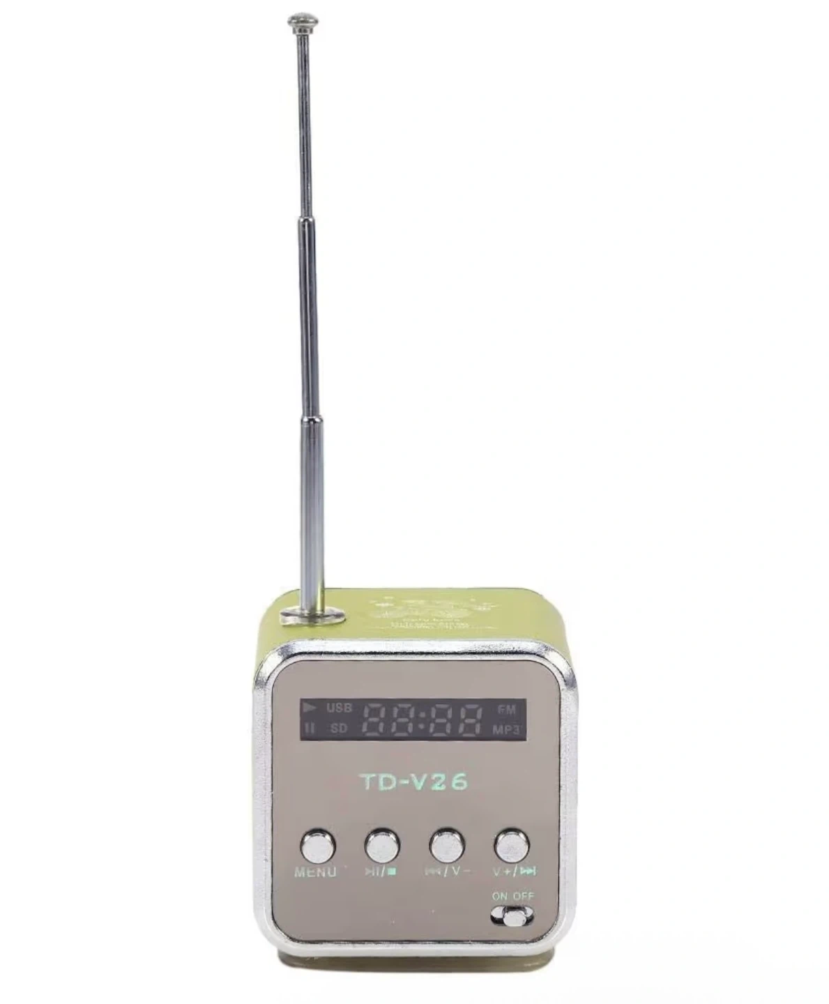 This is a TD-V26 mini portable speaker. It supports USB and SD card playback, and has an FM radio function. It's compact and lightweight for easy carrying.
