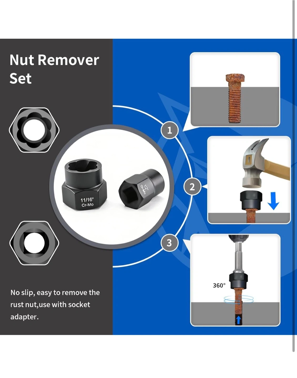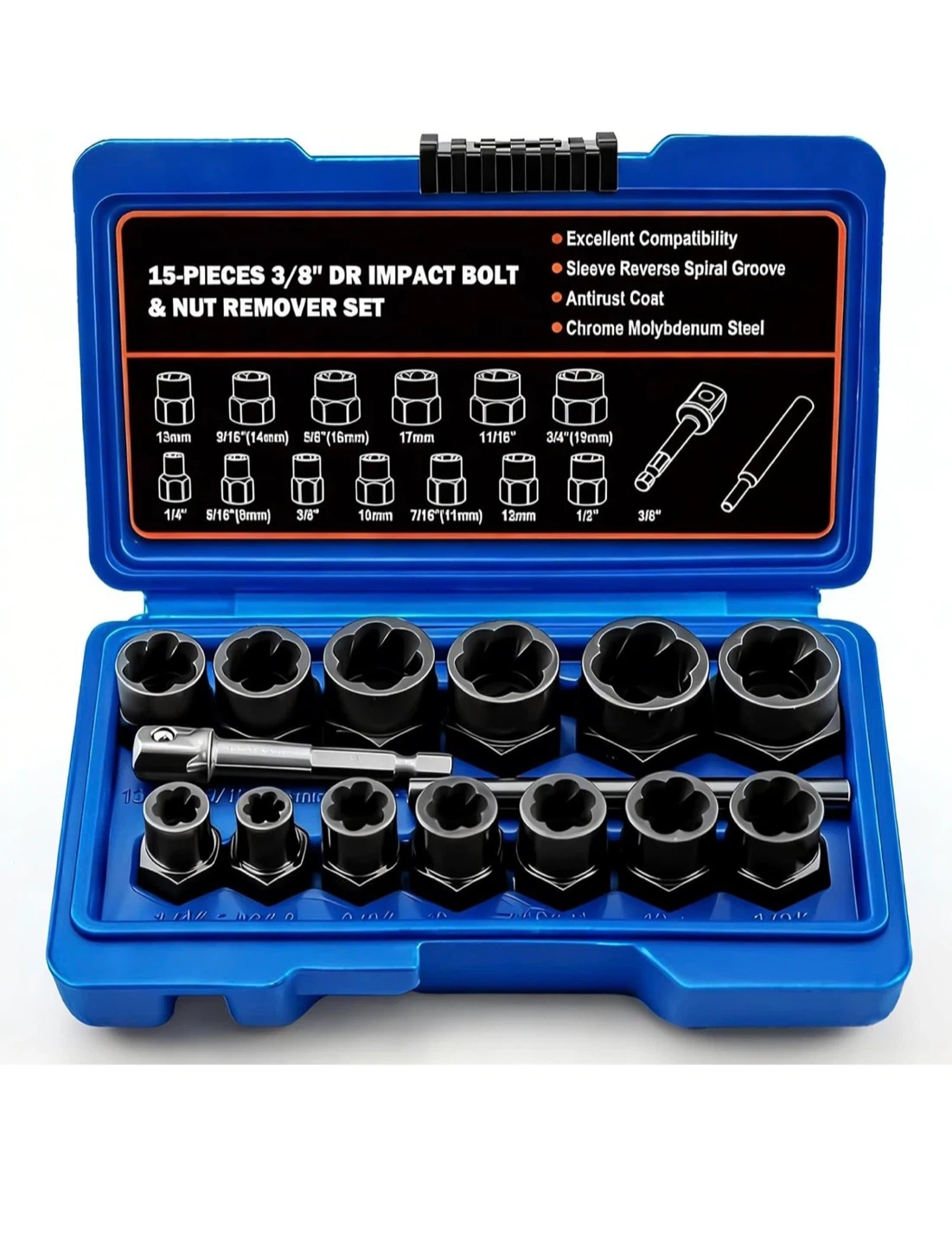 Stop struggling with damaged bolts! This 15-piece bolt & nut extractor set removes stripped, rusted, rounded, and stuck nuts quickly and easily. Perfect for mechanics, DIY repairs, automotive work, and home tool kits.