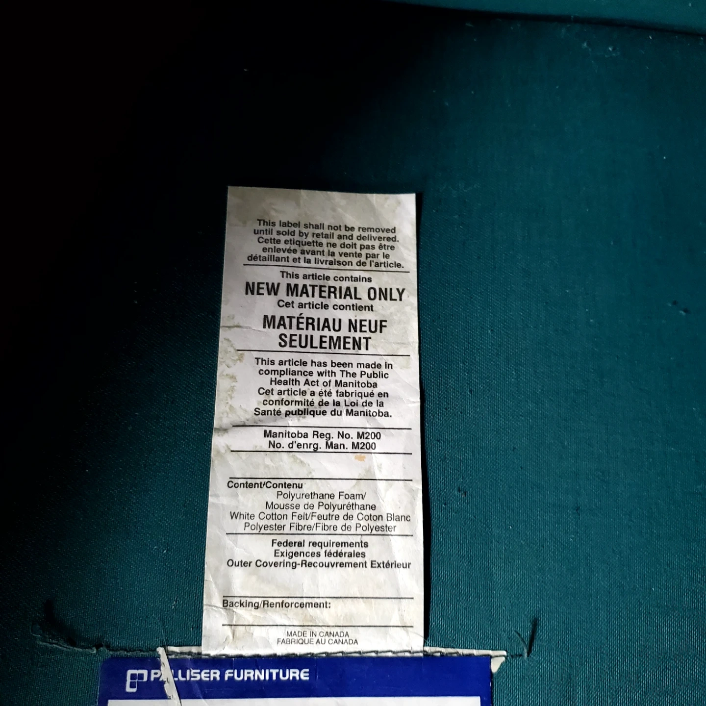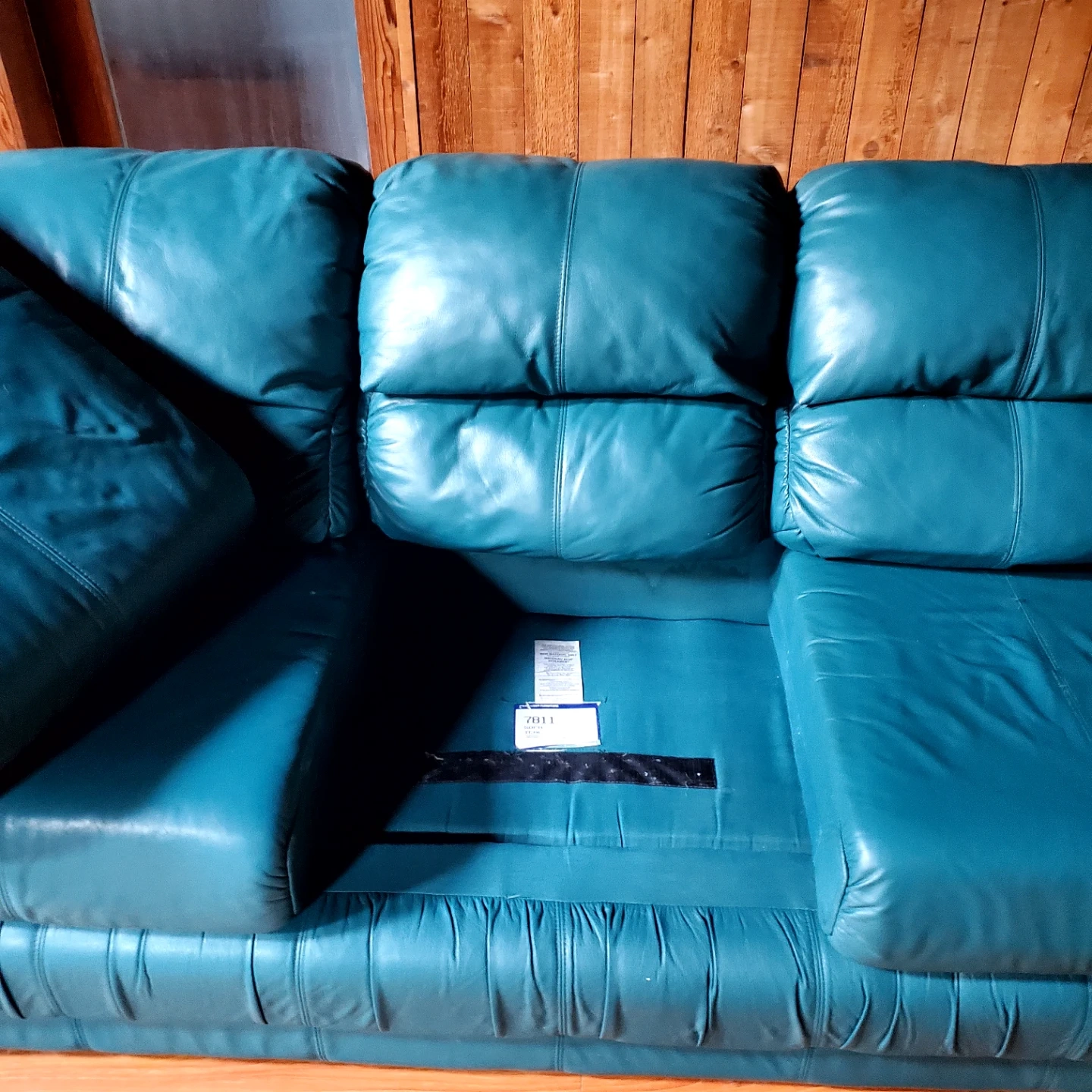 A teal leather three-seater sofa. It's in good condition and comfortable. This couch would fit nicely in a living room or den. Sorry I can't find the legs.. hence the price ๐