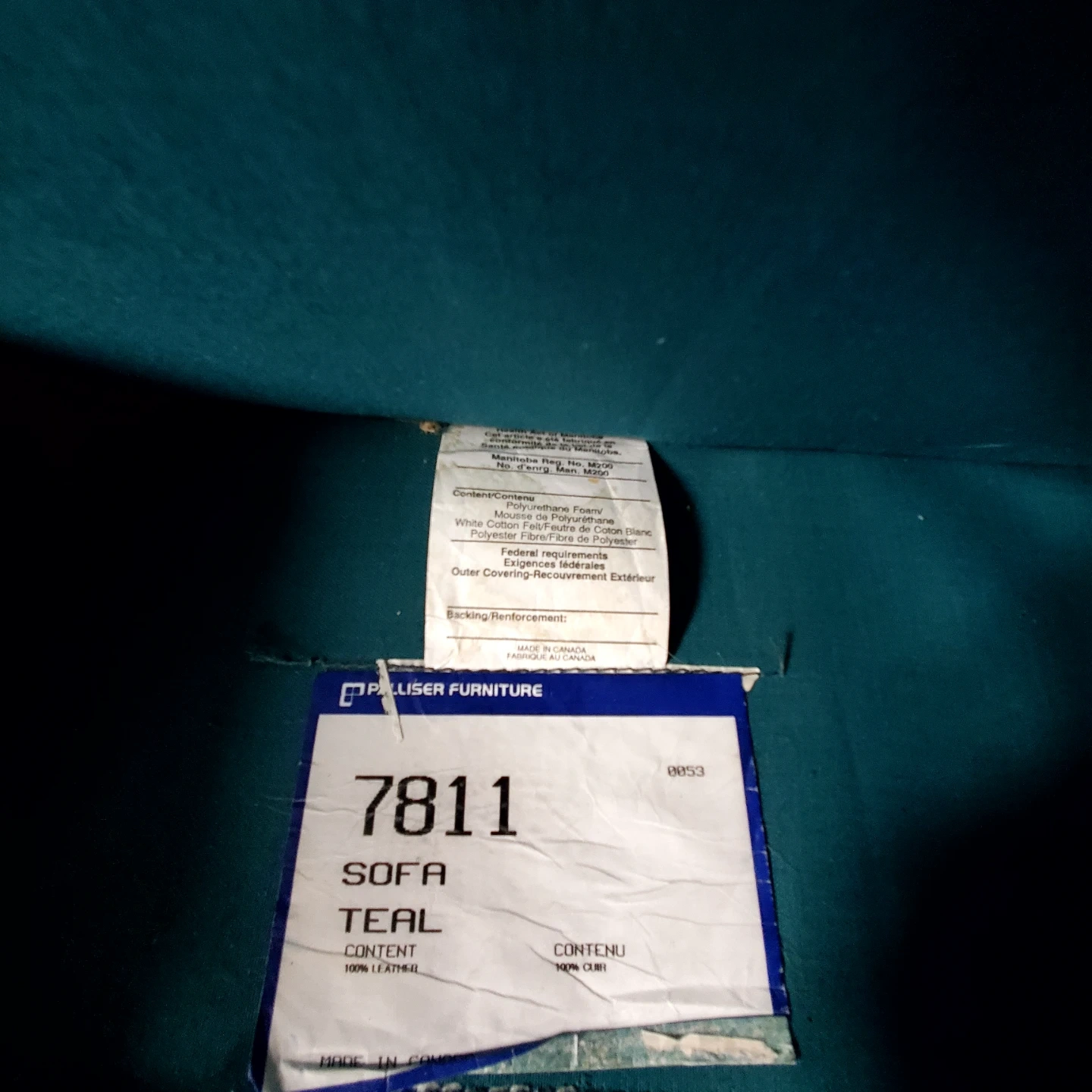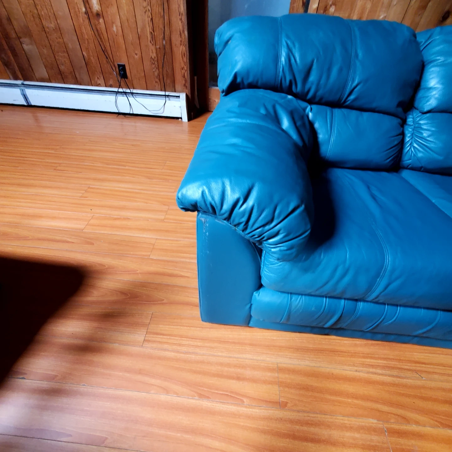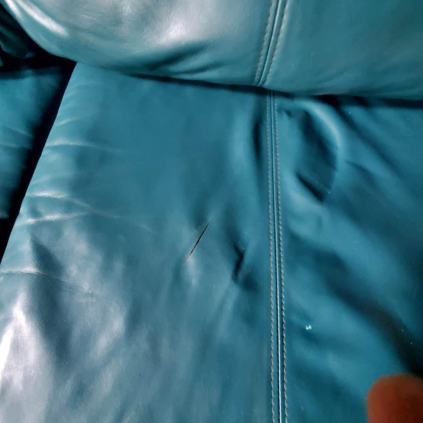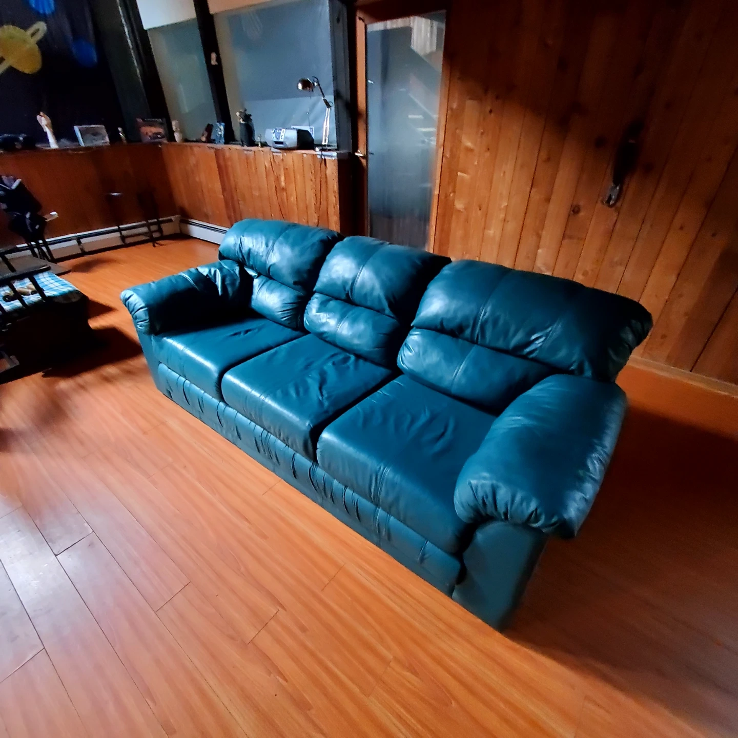 A teal leather three-seater sofa. It's in good condition and comfortable. This couch would fit nicely in a living room or den. Sorry I can't find the legs.. hence the price ๐