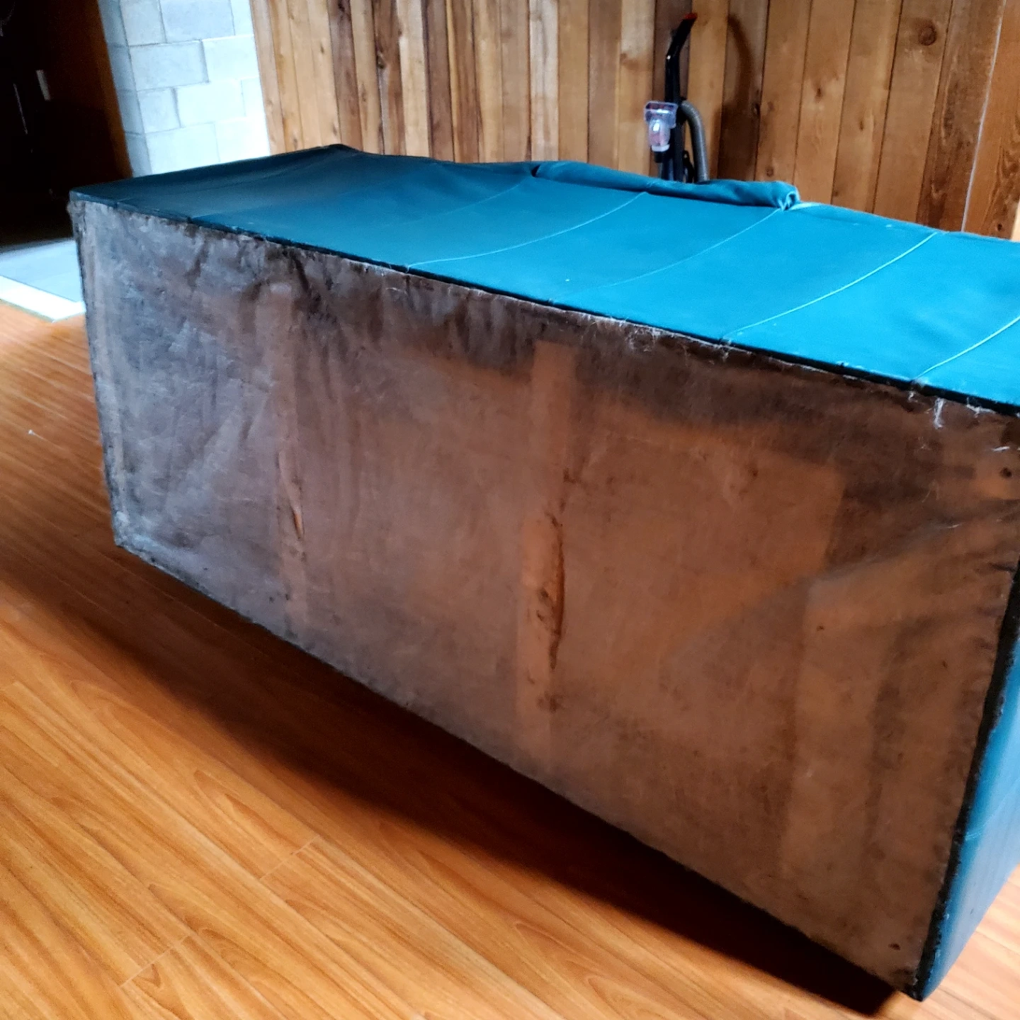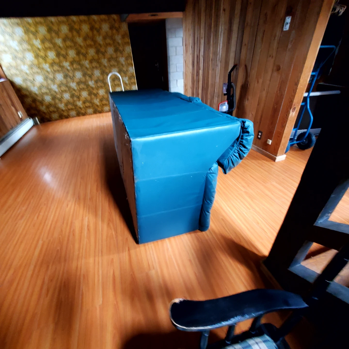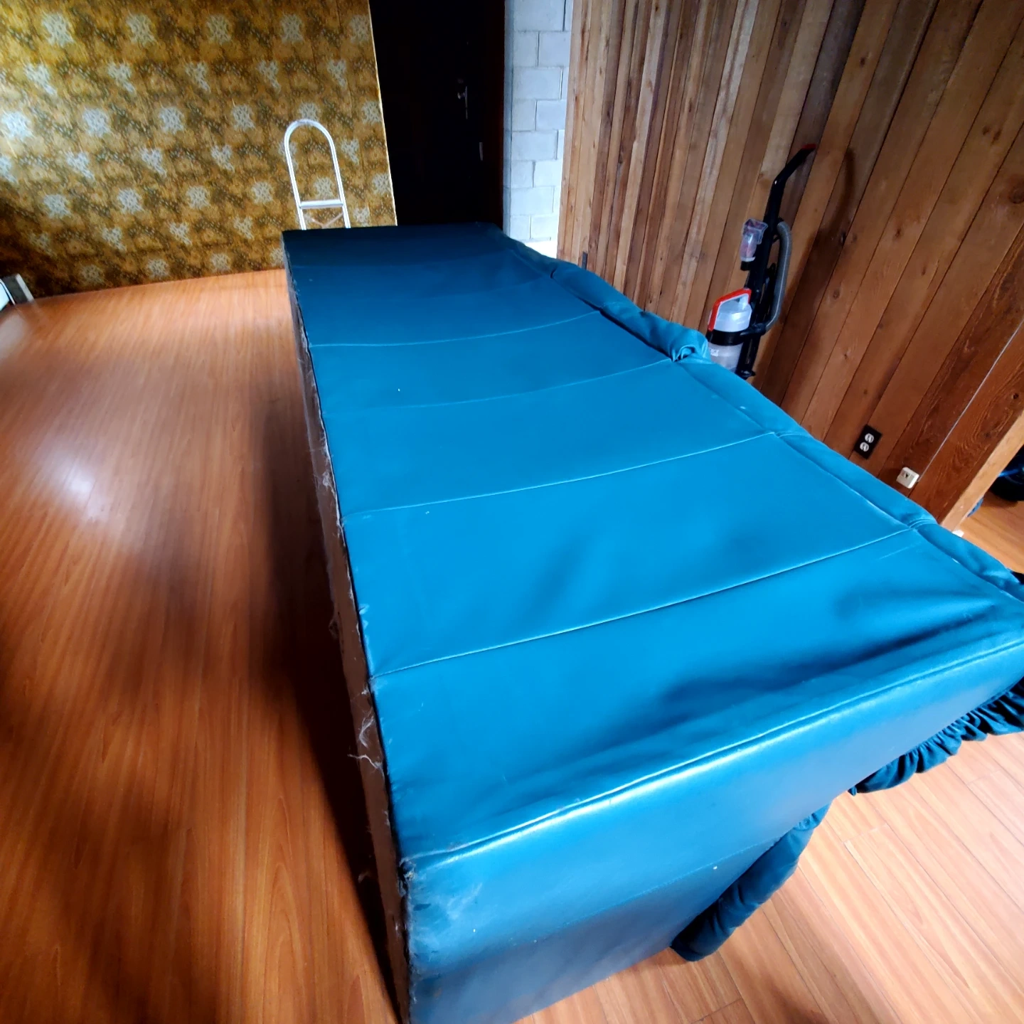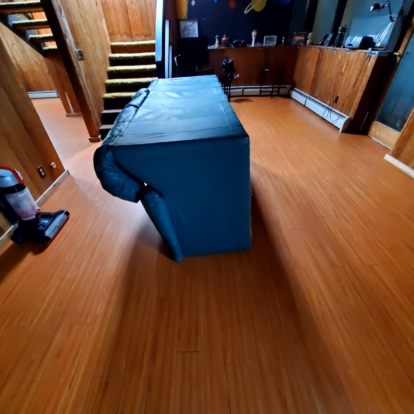 A teal leather three-seater sofa. It's in good condition and comfortable. This couch would fit nicely in a living room or den. Sorry I can't find the legs.. hence the price ๐