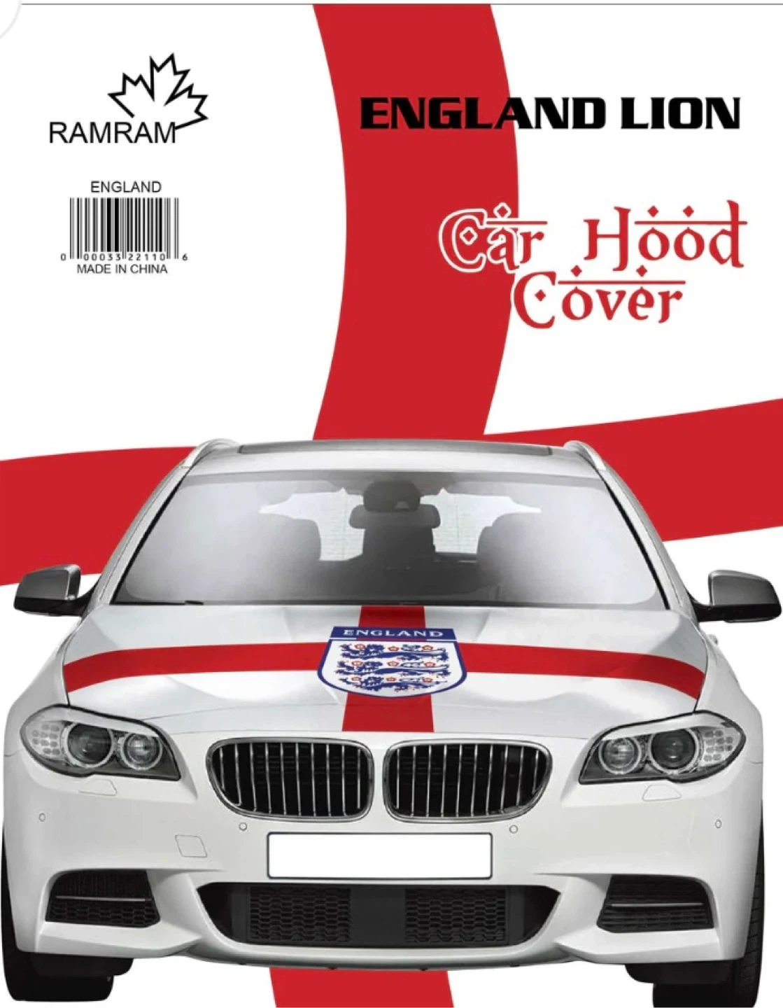 England Lion car hood cover features a bold red and white St. George's Cross design with the England crest. It's designed to fit over your car's hood for a patriotic look. Simple to apply for showing your team spirit!