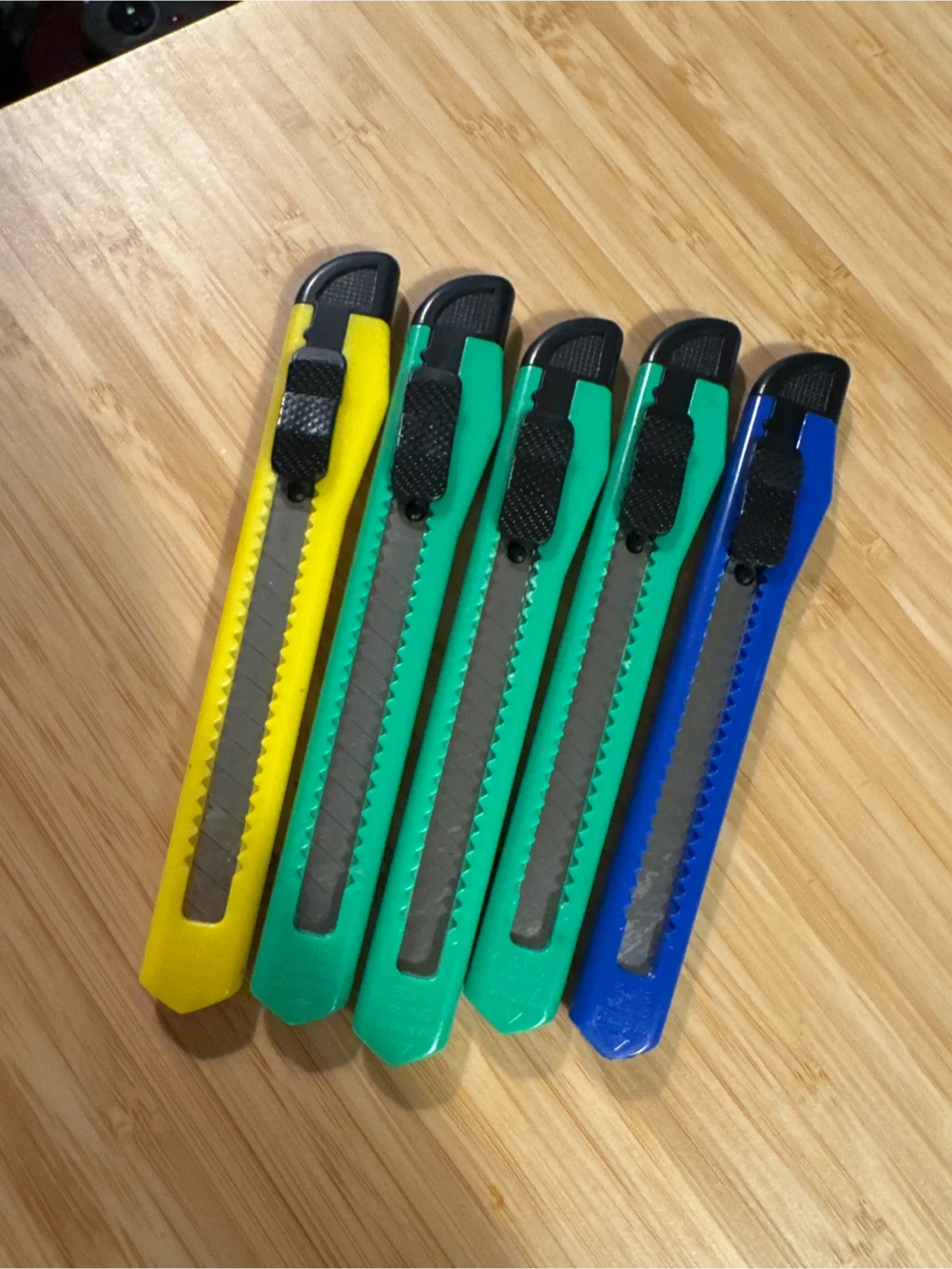 Selling a set of utility cutters! There's one yellow, three green, and one blue knife available. They're in good condition and ready for your next project