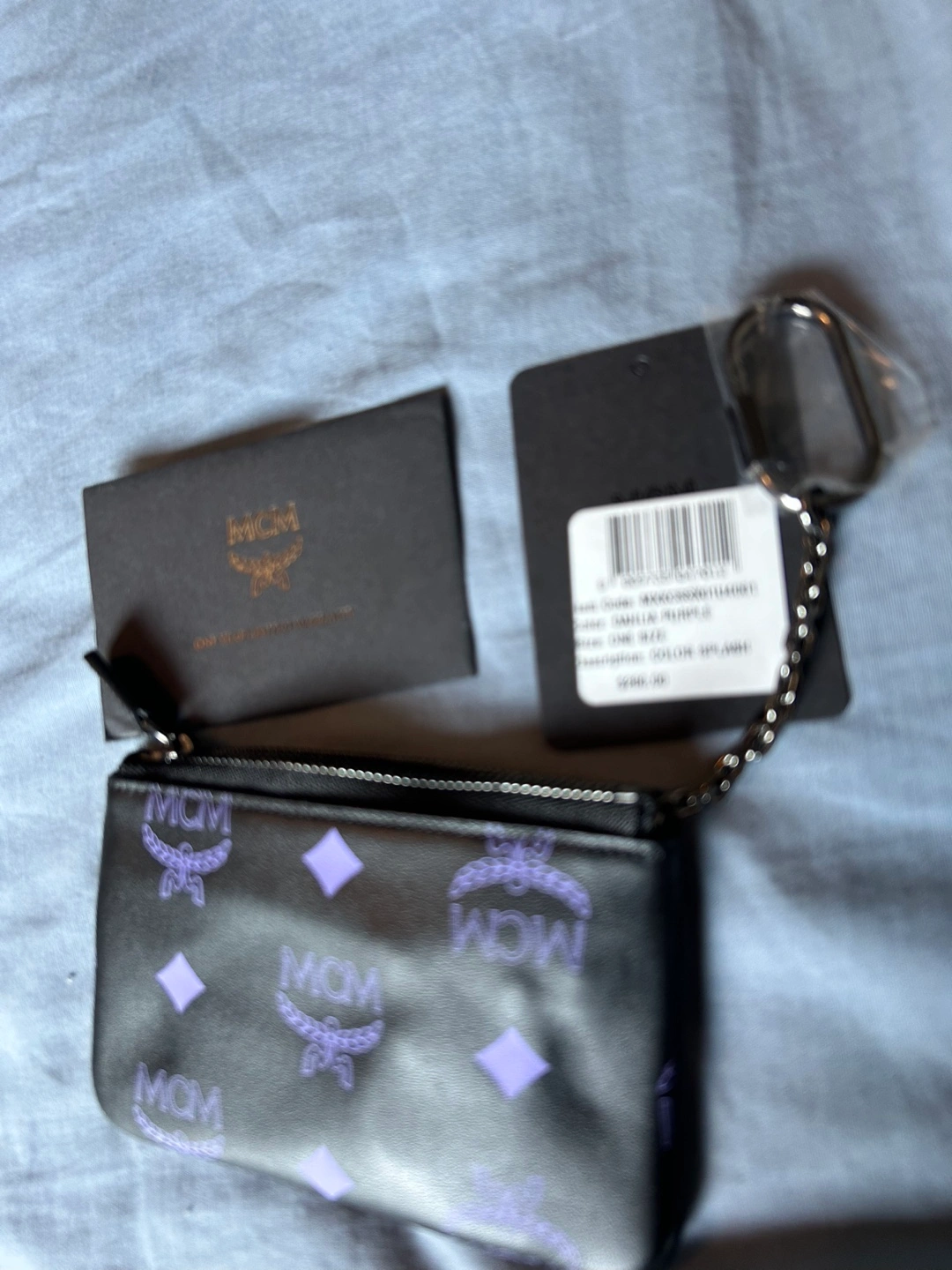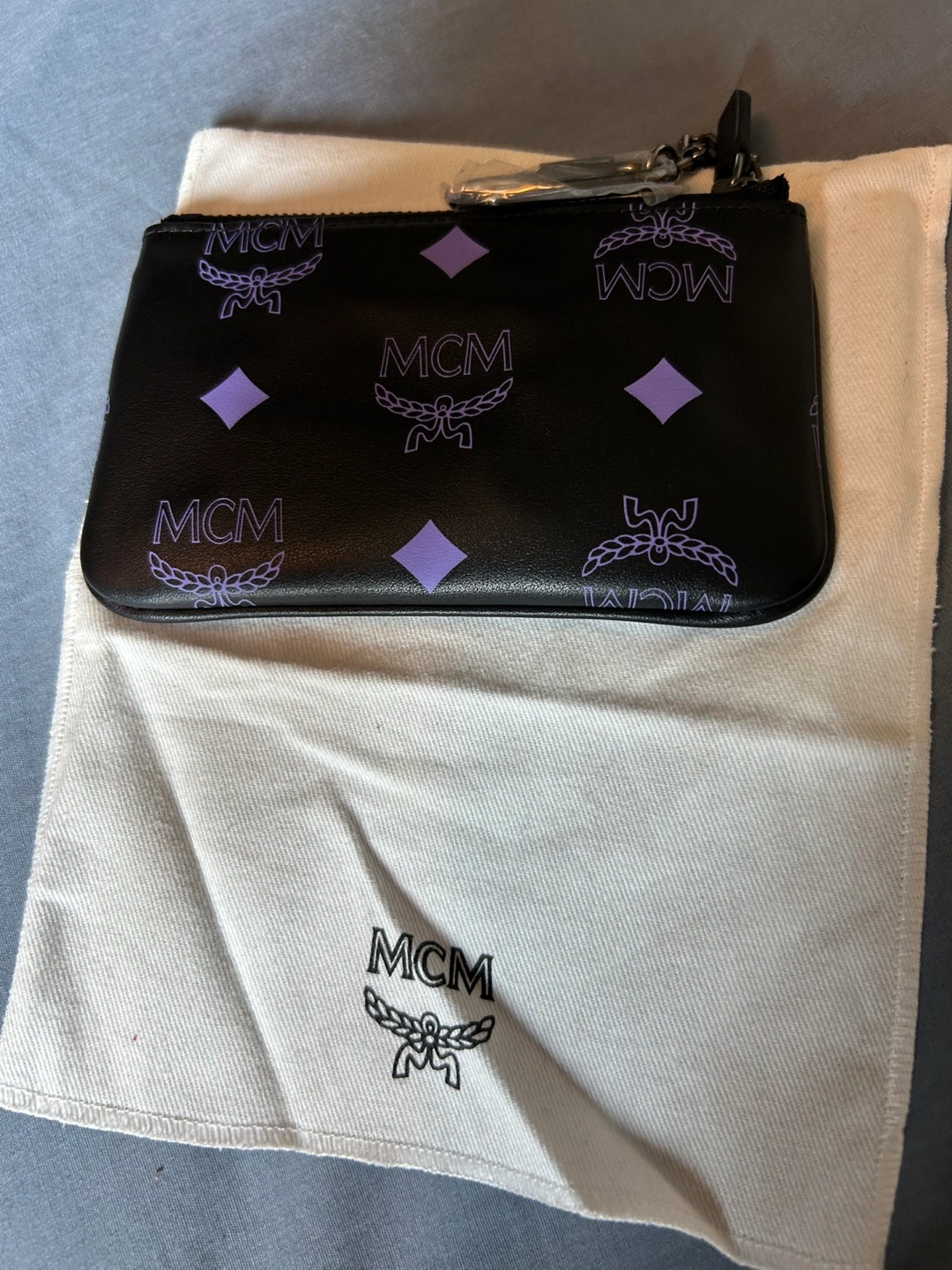 Small black pouch with a purple MCM logo. Features a zipper closure and a metal keychain. Includes dust bag and authenticity card. New with tags.